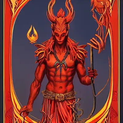 fantastic male fire Jinn ::5:: eshu exú guardian of the paths greek mythology with pitchfork symbol, statue wrapped in red cloth fire uplight eyes demon fire elements around demonic symbols demons on artstation black paper red orange gold neon brazilian white ink playing card with ornate border marc Simonetti, paul pope, peter mohrbacher, Dane Brennand detailed, intricate ink illustration Olga Dreba detailed high definition 8k photography glowing,