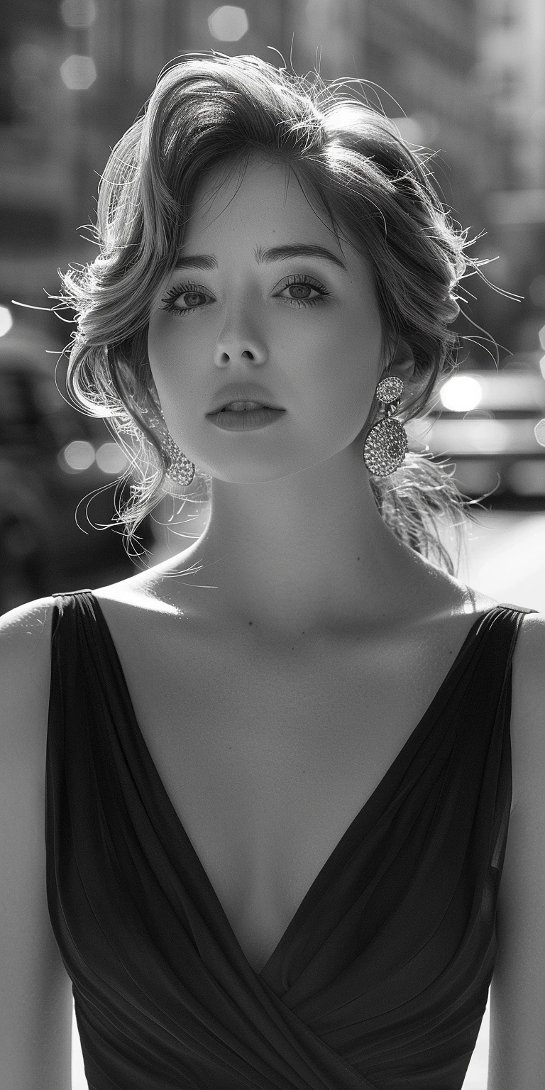 A black and white photo of an elegant woman in the streets of New York, wearing a simple dress with her hair up, posing for the camera, looking to one side, hyperreal photography, sunlight highlights details on her face and body, creating soft shadows that accentuate her features, contemplative expression, wearing large earrings, adding depth to the scene, vintage car, city street in the background --ar 1:2 --stylize 750