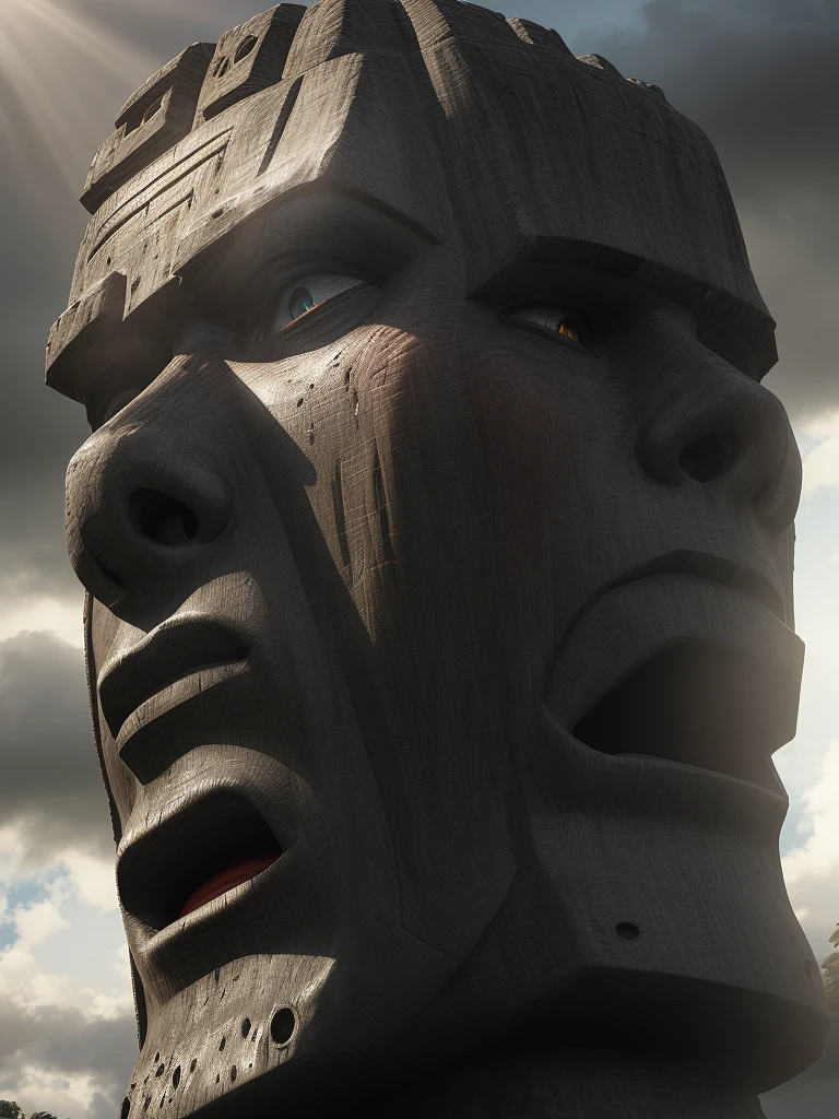 Photo of a ultra realistic moai, , dramatic light, cinematic lighting, battered, low angle, trending on artstation, 8k ultra HD, hyper realistic, focused, extreme details, unreal engine 5, cinematic, masterpiece, art by studio ghibli, intricate artwork by john william turner