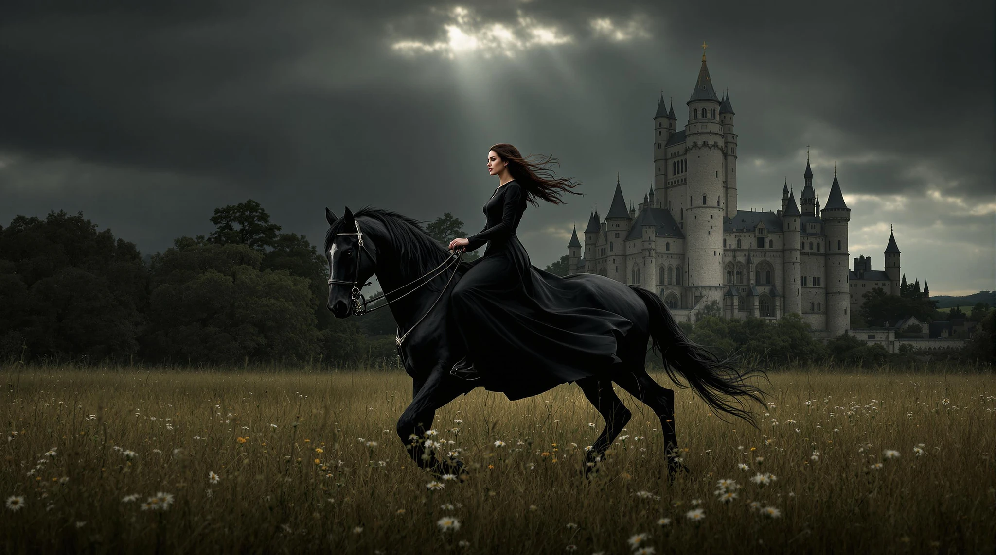 a woman riding a horse through a field, with a castle in the background. The woman has long dark hair and is wearing a black dress with a high neckline and long sleeves. She is holding the reins of the horse in her left hand and has her right hand resting on her hip. The horse is black and has a flowing mane and tail. It is walking through a field of tall grass and wildflowers, with a few trees scattered throughout. In the background, there is a large castle with tall towers and battlements. The sky is cloudy and dark, with a few rays of sunlight breaking through the clouds. The overall atmosphere of the image is one of mystery and adventure, with the woman and horse riding off into the unknown.