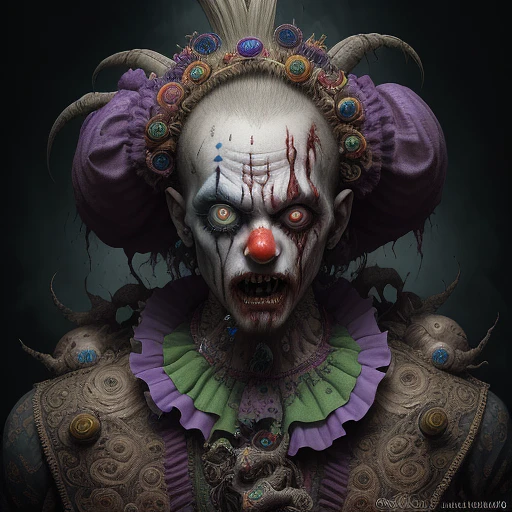 Jared Padelecki , zombie , uhd photorealisitc authentic psychotic angry madman wearing ornate clown costume and intricate voodoo makeup, shoulders, intricate details, vivid colors, frightening surroundings, correct details, in the style of amano, karol bak, akira toriyama, and greg rutkowski , perfect composition, beautiful detailed intricate insanely detailed octane render trending on artstation, 8 k artistic photography, photorealistic concept art, soft natural volumetric cinematic perfect light, chiaroscuro, award - winning photograph, masterpiece, oil on canvas, raphael, caravaggio, greg rutkowski, beeple, beksinski, giger, perfect composition, beautiful detailed intricate insanely detailed octane render trending on artstation, 8 k artistic photography, photorealistic concept art, soft natural volumetric cinematic perfect light, chiaroscuro, award - winning photograph, masterpiece, oil on canvas, raphael, caravaggio, greg rutkowski, beeple, beksinski, giger