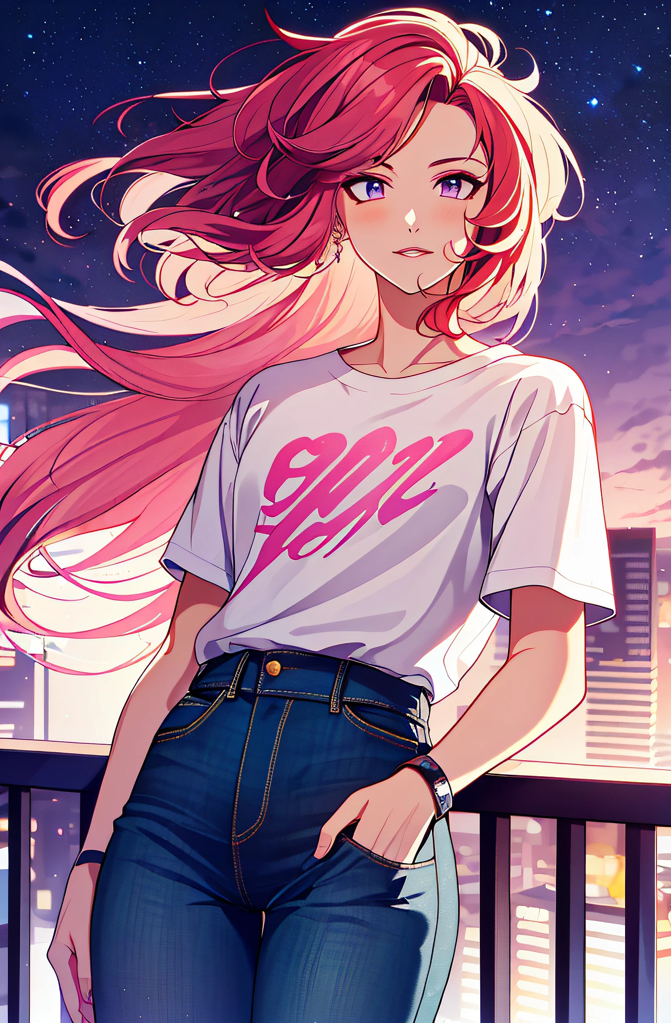(highres:1.1) , best quality, (masterpiece:1.3) , beautiful lighting, intricate (high detail:1.2) , 1boy, solo, transgender male, two tone hair, multicolored hair, white hair, pink hair, red hair, green hair, purple eyes, long hair, wearing a black and pink anime tshirt, denim jeans, makeup, wristband, lipstick, jewelry, depth of field, science fiction, cyberpunk, balcony, cityscape, beautiful night sky, (summer:1.2) , wind swept hair, {specular highlights : beautiful lighting : volumetric lighting} , fxaa