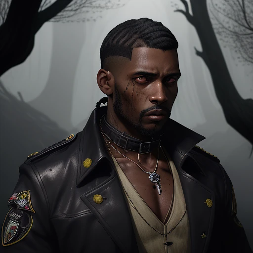 A black man, with short fade and line in hair, in a torn, government issued, blood stained trench coat, with a leather braided necklace witha single eyeball in the center of the neckalace sways from around his neck. Gazing across a stirring, bubbling swamp at Ravens nest deep in the background. Ravens Nest, a dark castle, built of dead trees and glowing caverns. In the style of a comic book cover. Issue no. 1. Title: Adventures of Akai-Zar Valious.