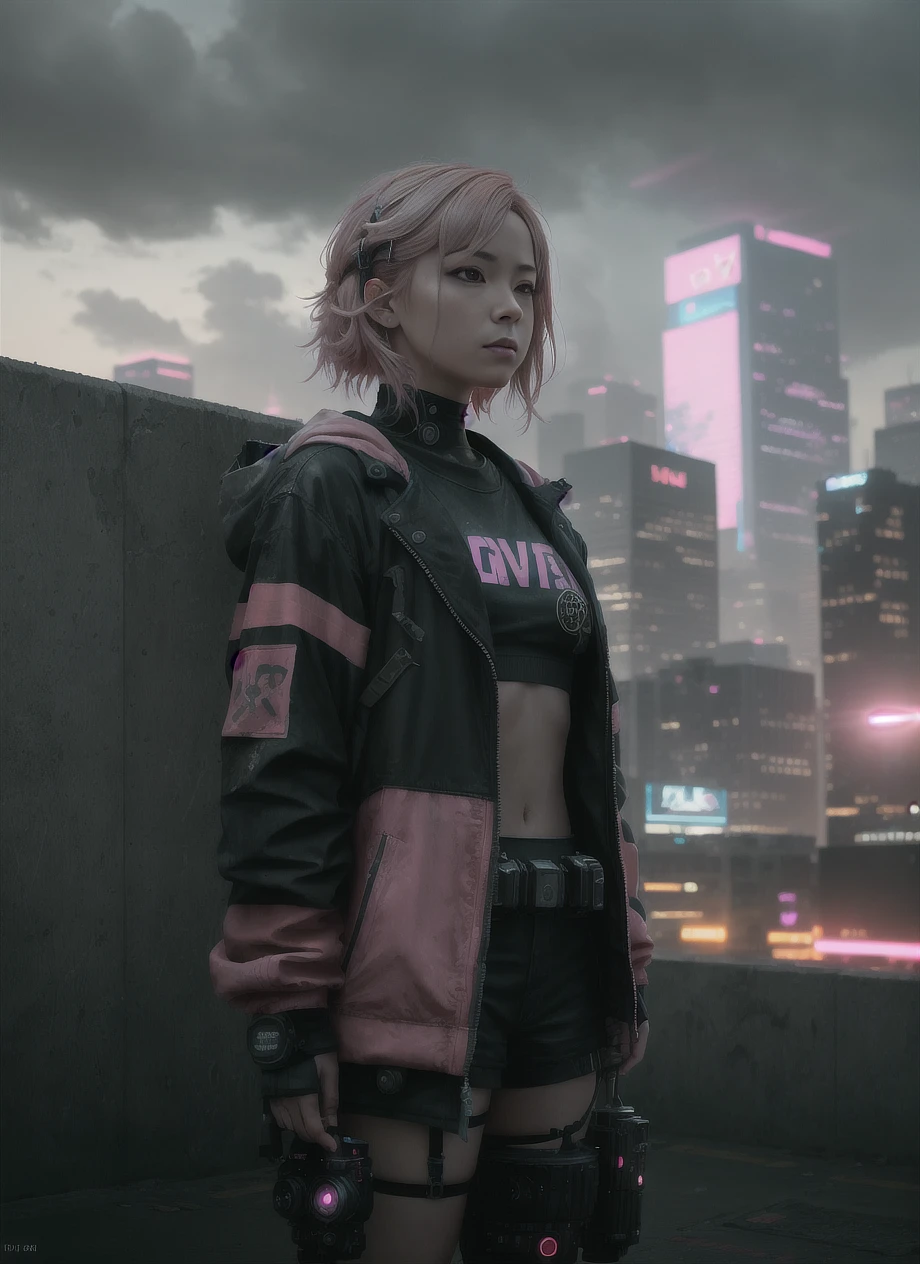 Dystopian, High Detail RAW color Photo, Full Shot, (cute female with pink hair) , (small breasts) , standing on an overlook, looking out at sprawling cyberpunk city skyline, perfect face, (highly detailed, fine details, intricate) , (lens flare:0.5) , (bloom:0.5) , raytracing, specular lighting, shallow depth of field, 200mm lens, hard focus, smooth, cinematic film still
