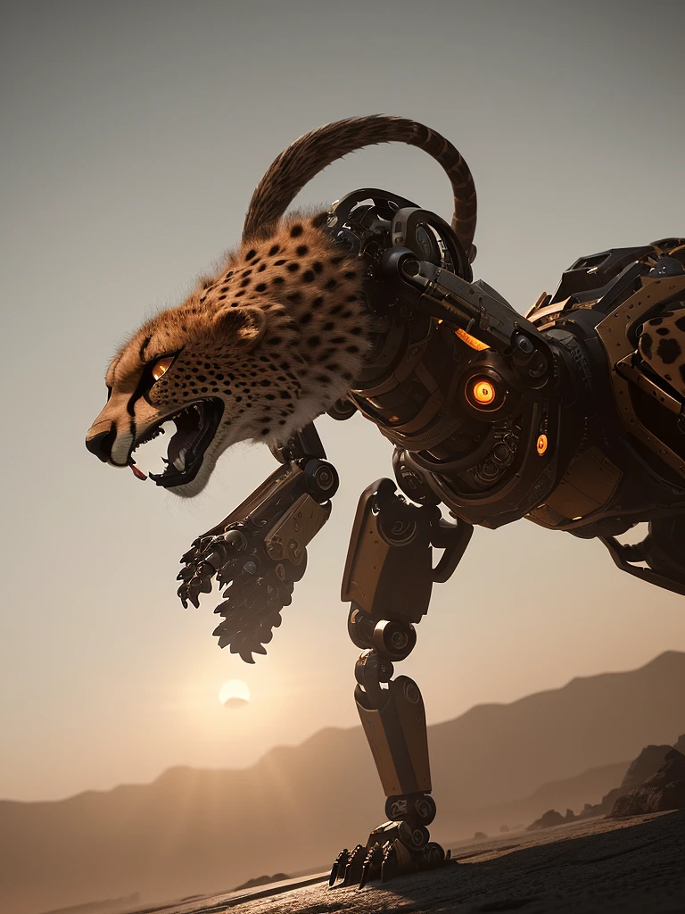 Photo of a robotic cheetah, dramatic light, pale sunrise, cinematic lighting, battered, low angle, trending on artstation, 4k, hyper realistic, focused, extreme details, unreal engine 5, cinematic, masterpiece, artwork by khalil studios