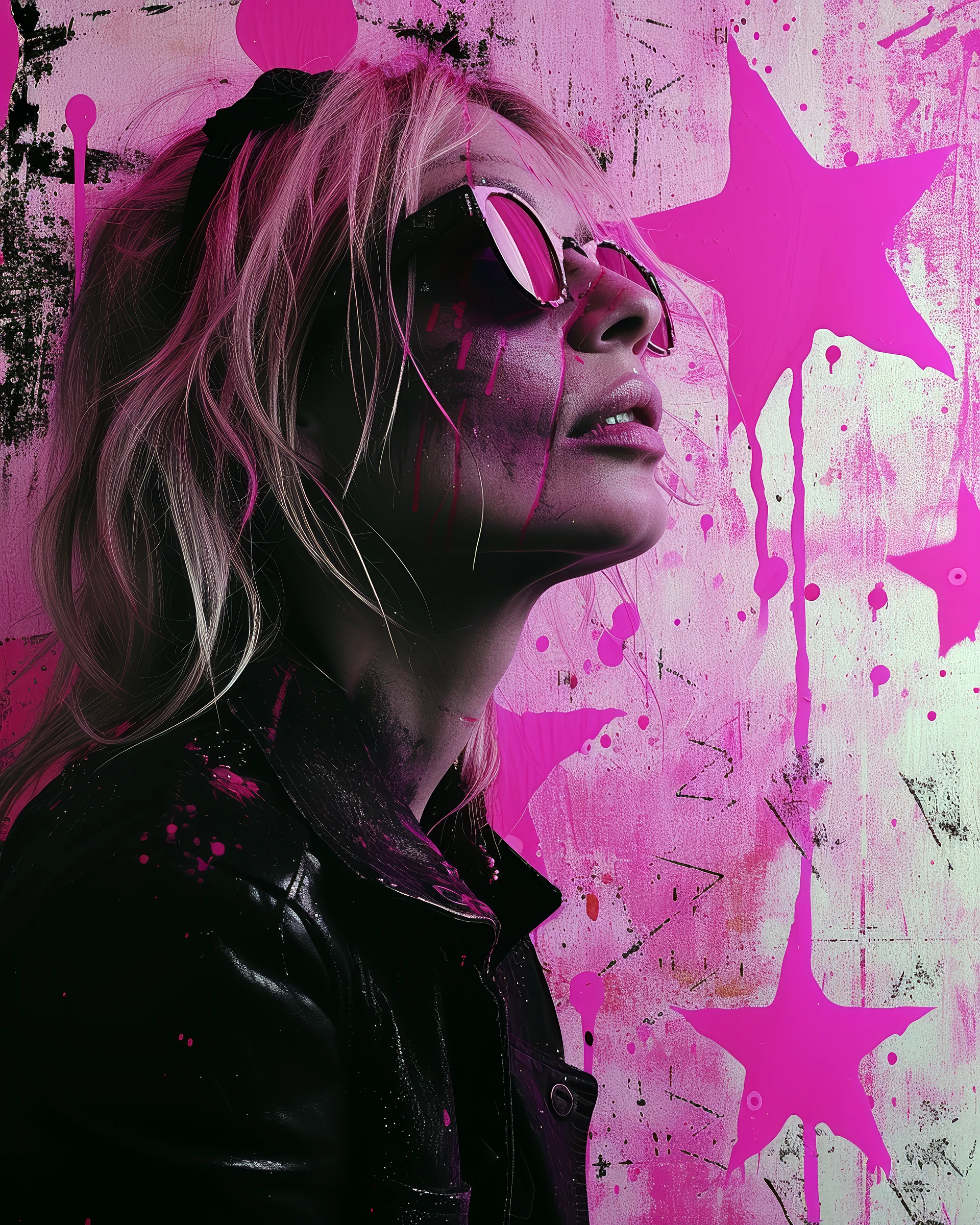 a woman with blond hair and pink stars on her face, in the style of photomontage, vibrant colorist, emila medková, splattered/dripped, light violet and light black, celebrity image mashups, kitty lange kielland --ar 51:64 --s 250 --v 6. 0 --style raw