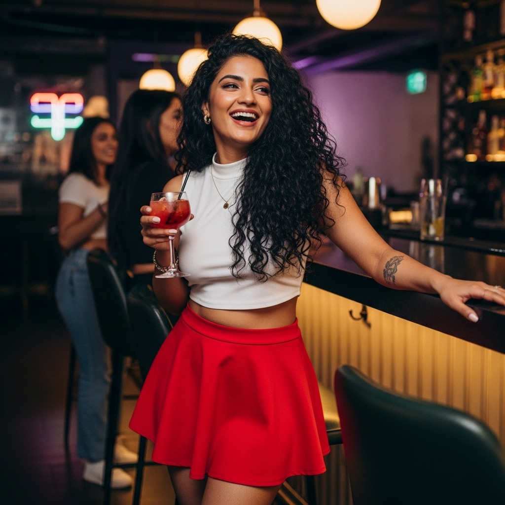 Google Imagen prompt: curvy indian wearing mini skirt, bar