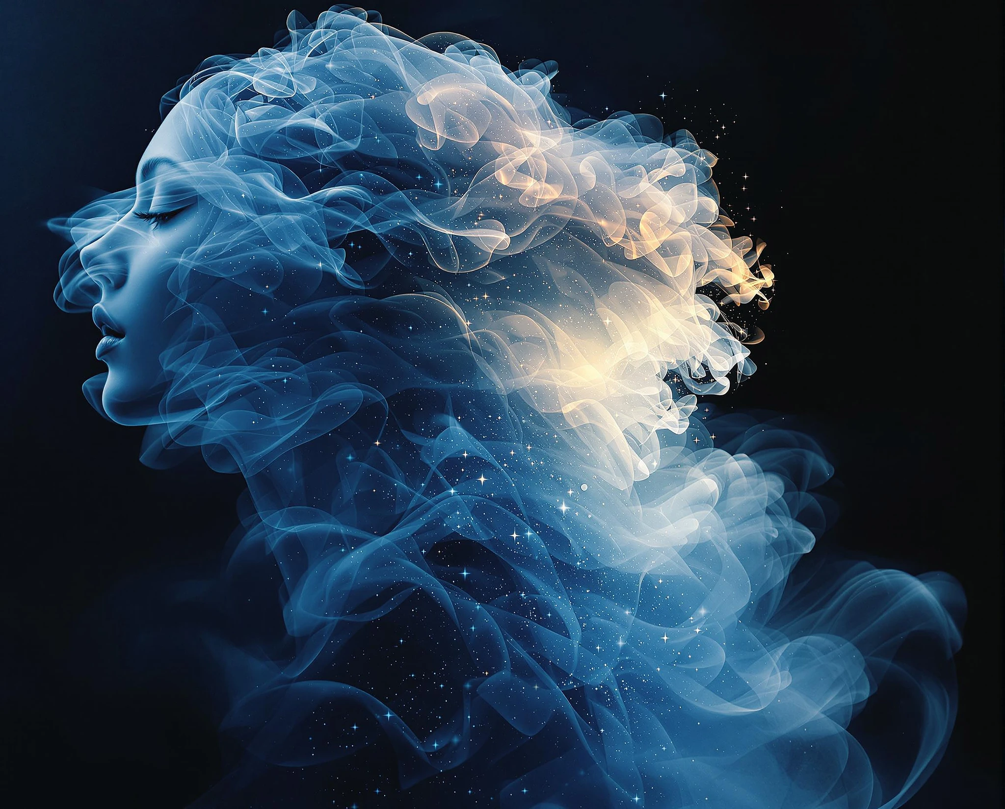 surreal semi realistic landscape photograph, cool blue light to dark gradients, muted soft tones, dark blue light blue midnight blue gradient tones just after the sun sets, blue hour twilight, featuring a surreal and ethereal double exposure style. It depicts the profile of a female figure with a serene expression, her skin appearing smooth and luminous. a large, wispy trailing wave of faint translucent wispy shapes that resembles mares tail cirrus clouds, star filled filled night sky integrated into the design. The color palette is a blend of blues, light and dark contrasting shades and shadows, and faint wispy diffused muted hues, creating a dark emotionally charged atmosphere. The background is a dark gradient, enhancing the powerful tumultuous quality of the scene. The overall composition is balanced but powerful, with intricate details and a sense of elemental power, cool luminous glow. , adding a serene tone to the image. The overall composition is rich in color and detail, creating a soothing and meditative atmosphere.
