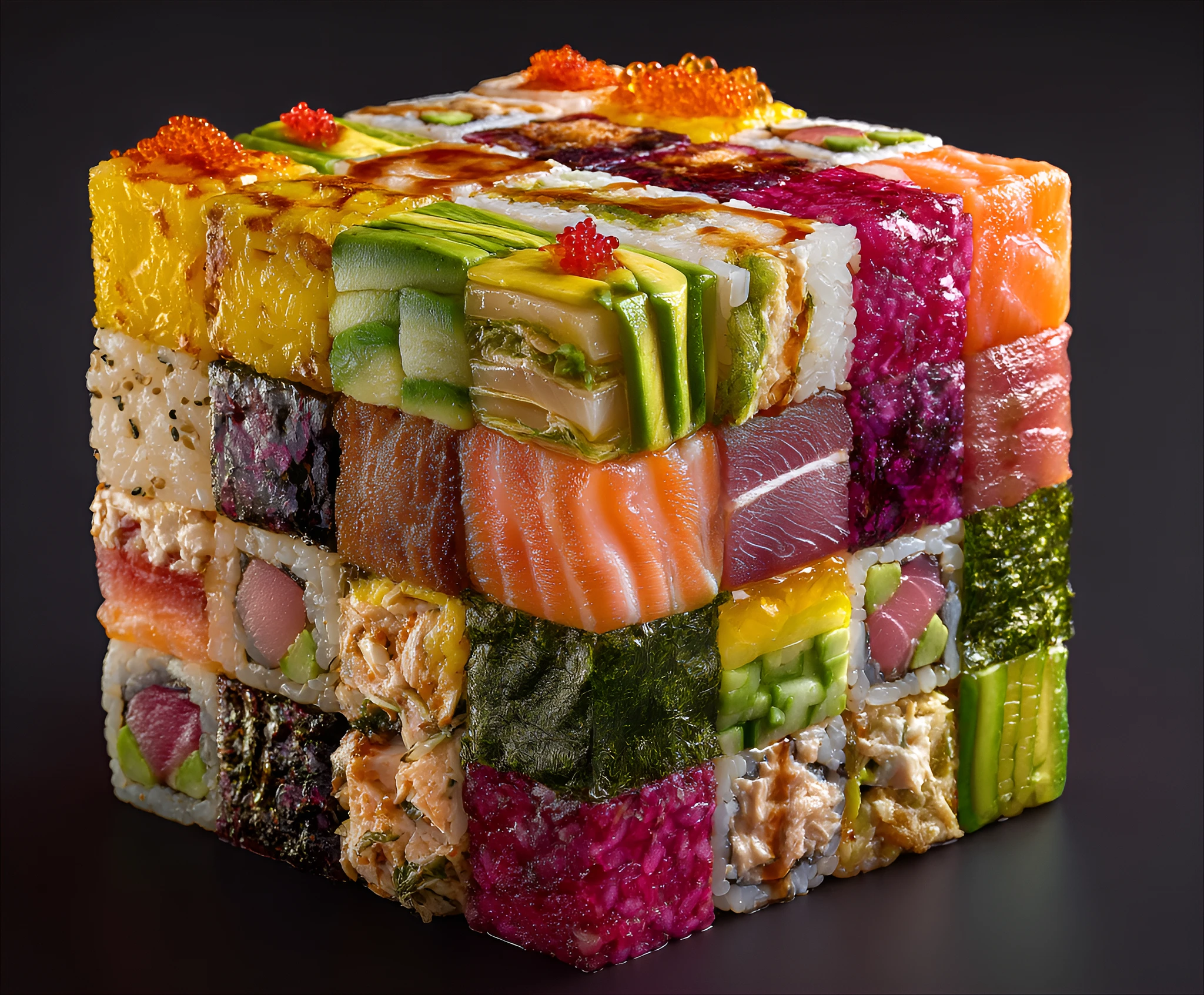 large, cube-shaped structure composed entirely of various kinds of sushi. Each small square within the cube is filled with a different sushi piece, creating a visually appealing mosaic of colorful ingredients. The sushi pieces include salmon, tuna, avocado, cucumber, crab meat, and other fillings, displayed in a variety of colors, including salmon pink, vibrant orange, pale yellow, and green. The sushi rice is white, and the nori seaweed is a dark, rich black. The cube is positioned in the center of the image, angled slightly towards the viewer. The background is a simple, deep black, contrasting with the bright colors of the sushi. The lighting is bright and highlights the details of each sushi piece. The composition is geometric and playful, showcasing the variety and artistry of sushi. The perspective is straight-on, with a close-up view of the intricate arrangement of the sushi.