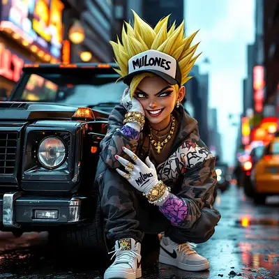 cyberpunk GTA, DRAGON BALL GT BROLY CHARACTER, WEARING A sweater WITH THE TEXT "MILLONES" WITH HORROR FONT ON THE HOODIE, hoodie off , techwear streetwear look and clothes, we can see them from feet to head, highly detailed and intricate, golden ratio, vibrant colors, hypermaximalist, futuristic, cyberpunk setting, luxury, elite, cinematic, techwear fashion, Errolson Hugh, Nike ACG, Y3, ACRNYM, matte painting --ar 2:3 --q 2 --v 5 NEXT TO A SUPERCAR in the style of looney tunes modern resolution just like the looney tunes are in this current time on television with some micro unreal engine 5 effects, highly detailed with fantastic 8k sharp focus quality surroundings, and without any deformity or multiple body parts