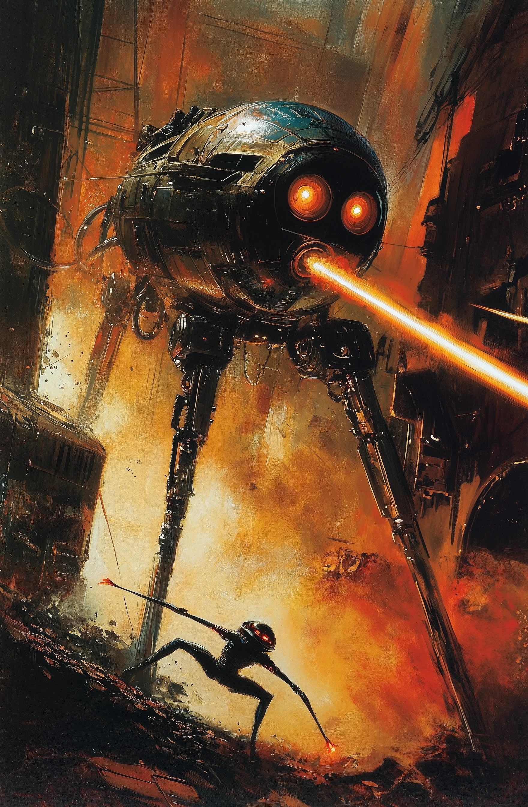 A robot is shooting laser beams from its eyes at an alien being pulled on the floor with his legs, illustration for a science fiction book cover in the style of Robert McGinnis and Frank Frazetta. --ar 61:93 --v 6. 1