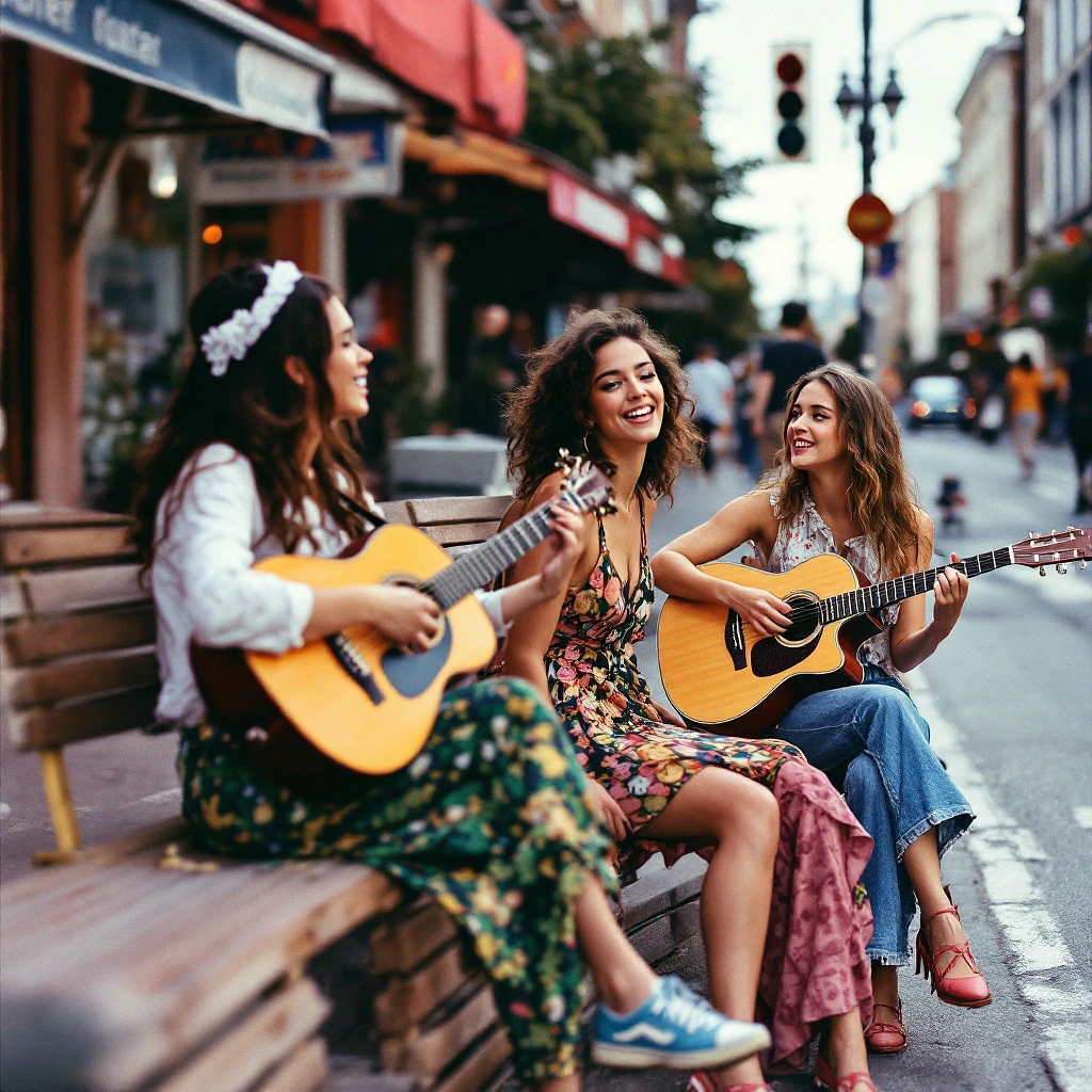 A photograph of three girls playing music on the street in the style of Pop Art with a medium aspect ratio