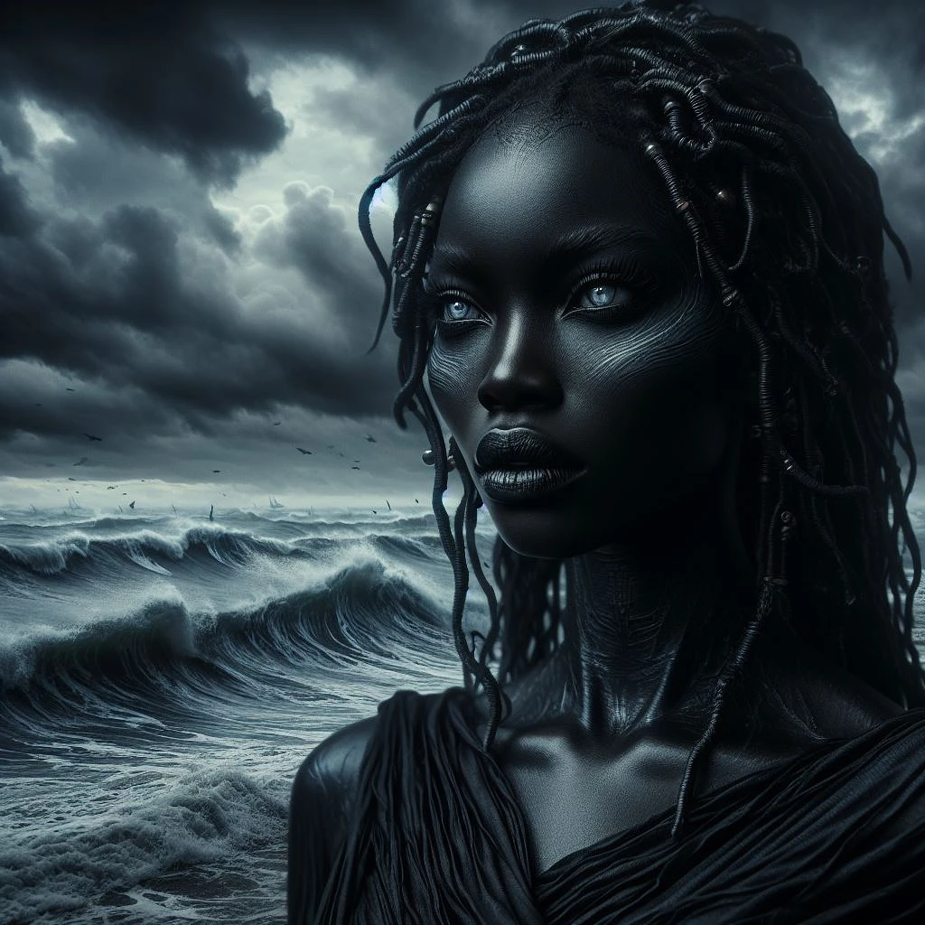In this portrait, Yemoja is depicted in her Dark Tide skin, standing on a dark and stormy beach. The waves crash against the shore with an ominous energy, and the sky is filled with dark clouds. Yemoja herself is draped in flowing black robes, and her eyes seem to glow with an otherworldly power. The use of advanced lighting and shading techniques, combined with high-quality textures and materials, create a stunningly realistic and foreboding scene.