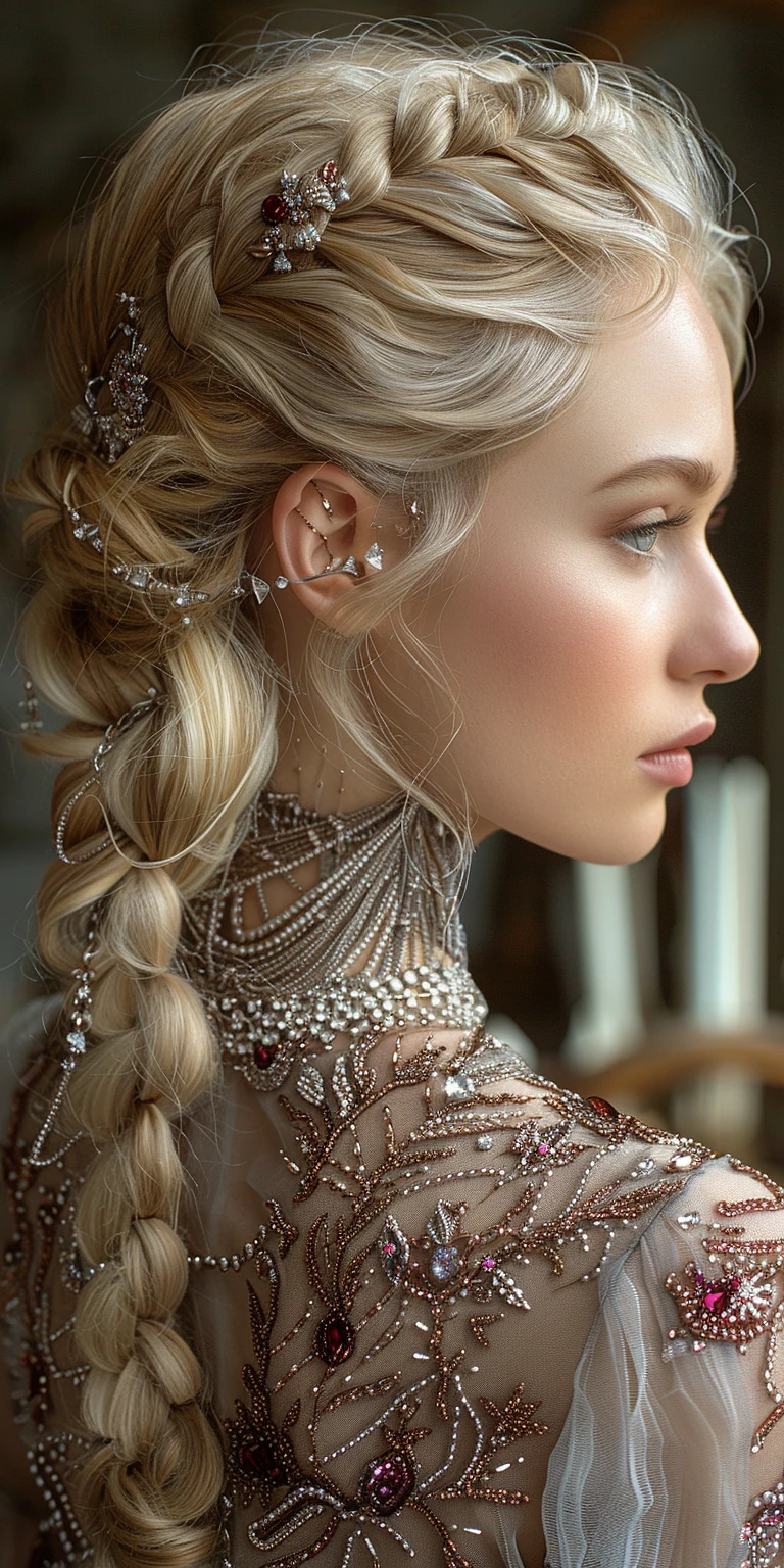 A beautiful blonde woman with braided hair adorned in silver chains and jewels is seen from behind, looking to her right side, in the style of ultra-realistic photography, high detail, sharp focus --ar 1:2 --stylize 750