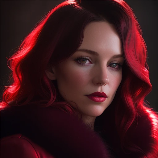 rachel wyeth in her red fur coat, in the style of captivating lighting, glamorous hollywood portraits, close up, dark paradise, retro-style, dark violet and light red, wavy --ar 2:3 --v 6. 0