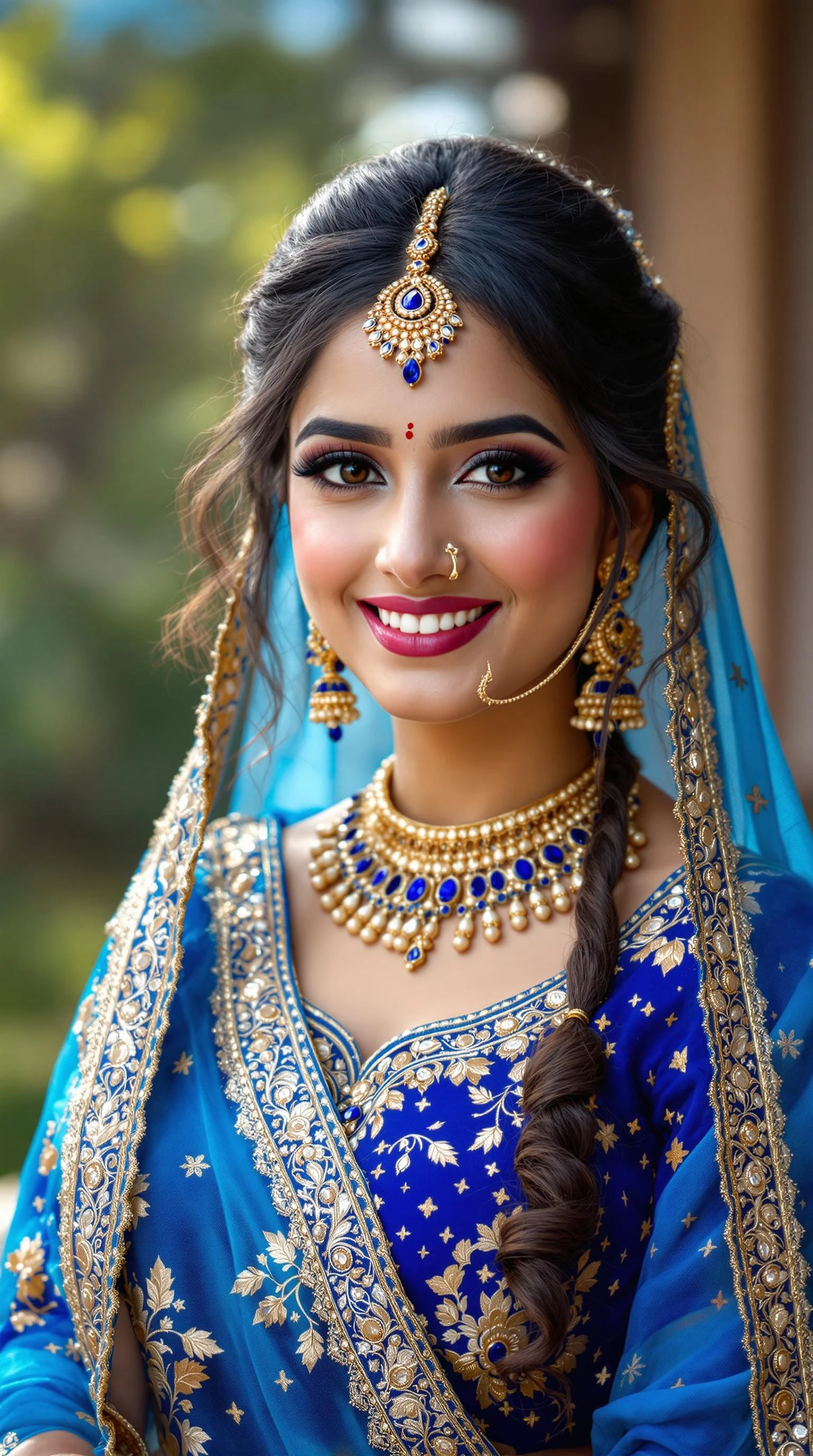 "A highly detailed ultra HD 8K realistic portrait of a young Indian woman dressed in a stunning royal blue lehenga with intricate golden embroidery. She wears traditional jewelry, including a maang tikka, bangles, and a nose ring, with a beautifully draped sheer blue dupatta over her head. Her expression is confident and graceful, with a radiant smile. The background is softly blurred with a natural outdoor setting, giving a cinematic depth to the image. The lighting is soft and natural, enhancing the details of her outfit, jewelry, and facial features. Shot with a professional DSLR, ensuring ultra-sharp details, natural skin texture, and realistic colors. "