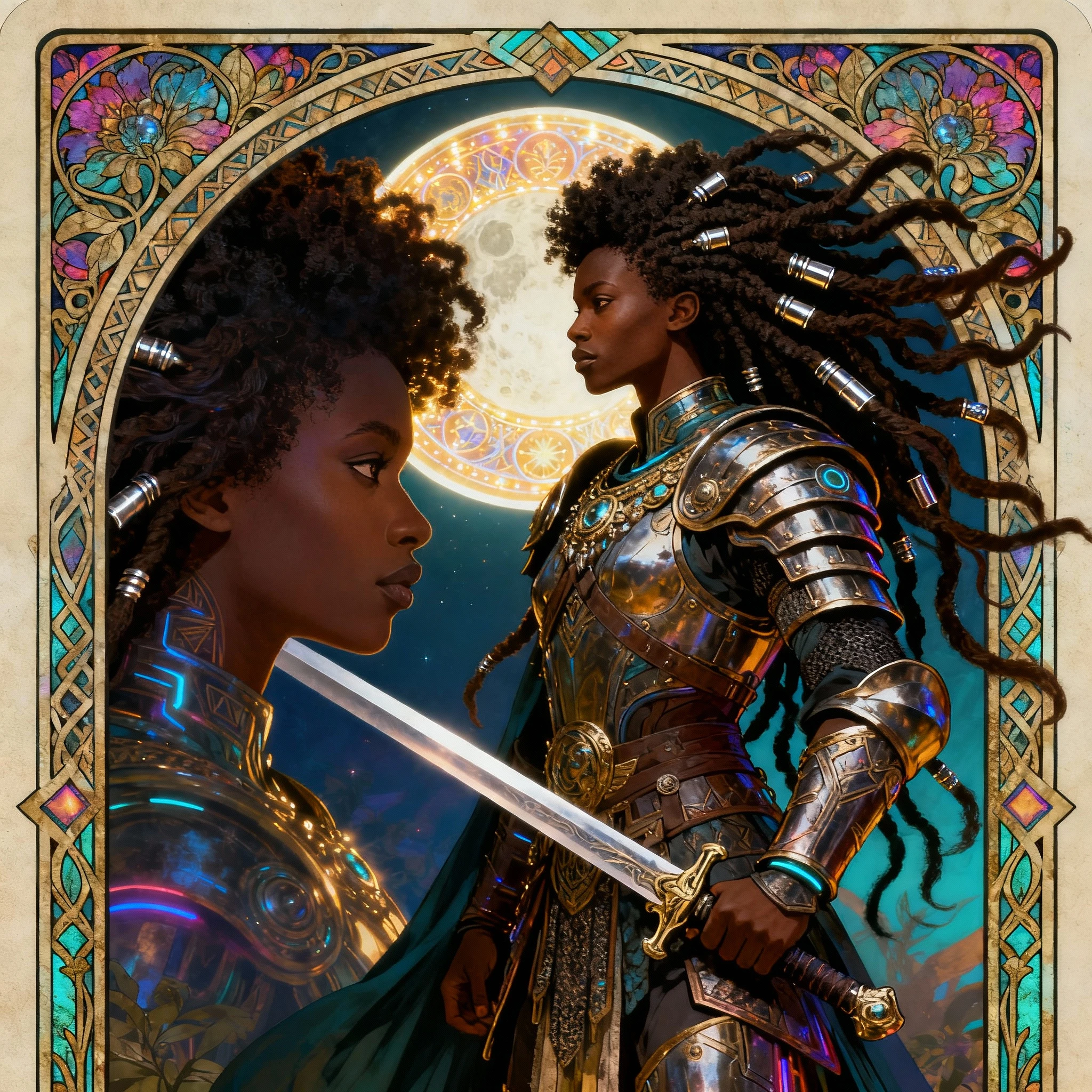 tarot card with intricate detailed frame around the outside | side profile of head with flowing Afro locs, full body wearing ancient warrior armor with sword and moon in background| Show full card and, afro futuristic | styled in Art Nouveau | insanely detailed | embellishments | high definition | concept art | digital art | vibrant,