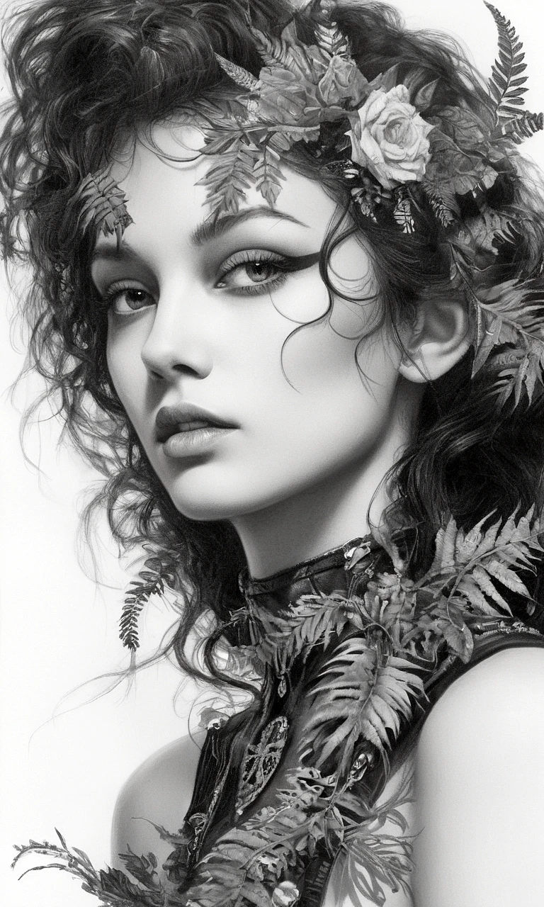 best quality, 4k, highres, masterpiece, ultra-detailed, realistic, black and white highly detailed drawing illustrations, black haired woman in lace dress, fern bunches, sharp focus, complex cinematic, candid, creative, innocent, perfect, beautiful, elegant, intricate, confident, dynamic, volumetric lighting, cinematic angle, glamour vibrant,