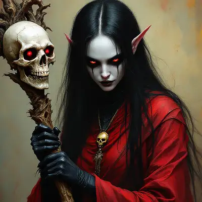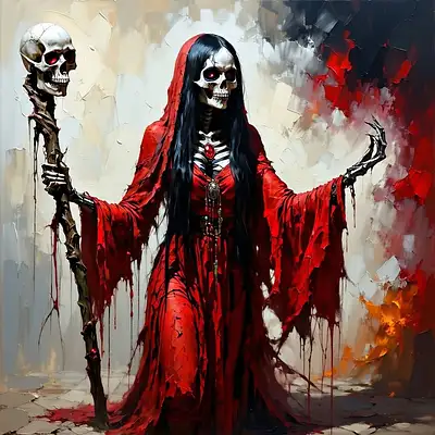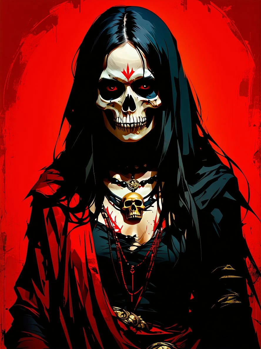 Modern flat design, digital illustration, dark gothic fantasy, cinematic lighting, intricate detail, silhouetted, back lit. Character. A gaunt Eberron elf priestess with long black straight hair. She has black eyes. Her face is covered in La Catrina facepaint with a black and white skull motif. She wears red robes and a necklace with a single golden skull. She is fearsome. Simple 2D shapes.