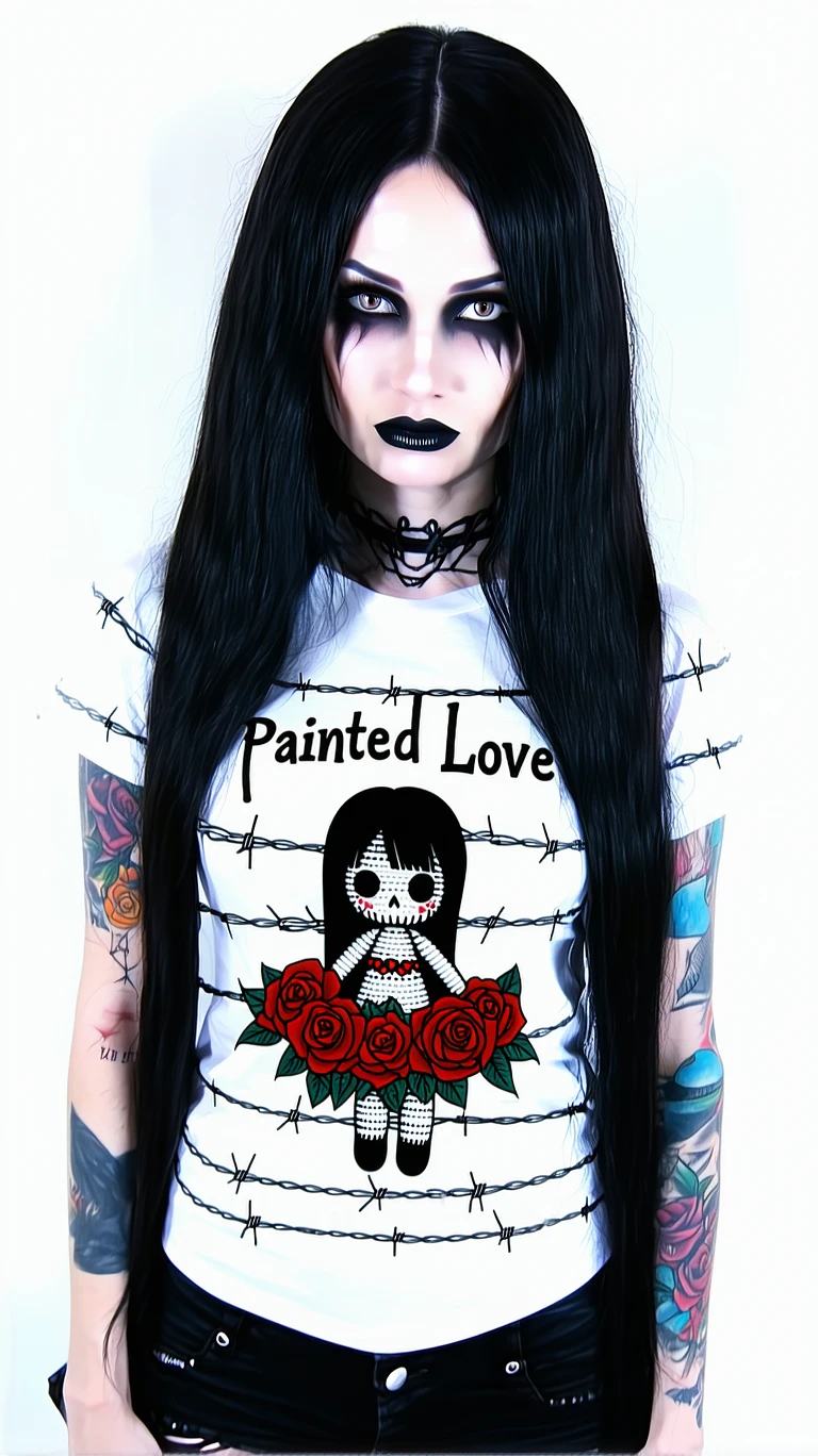 A gothic woman with long black hair wearing a white t-shirt featuring the original design with the text 'Painted Love' in correct gothic typography, barbed wire background, black roses, and the crocheted skull doll in the center, photorealistic style, aggressive mood, bird's-eye view