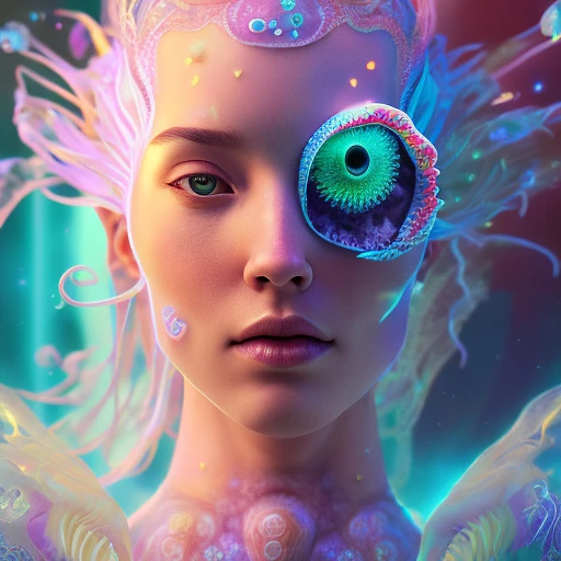 goddess close-up portrait ribcagel. jellyfish phoenix head, nautilus, orchid, skull, betta fish, bioluminiscent creatures, intricate artwork . octane render, trending on artstation, t symmetrical artwork. cinematic, hyper realism, high detail, octane render, 8k