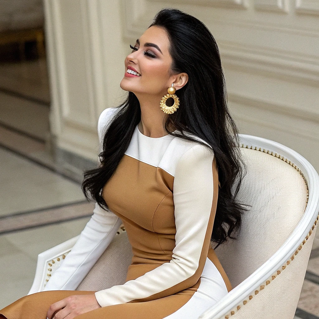 beautiful tatar lady, stunning beauty, long black hair, brown eyes, intricate designed by Dior, slightly round belly, beige and amber hues, bodycon dress with white sleeves, golden earrings, side shot, beautiful light on her skin, happy expression, wide hips, wide angle photo from waist up, sitting in chair, pensive pose, style of vogue fashion photography --v 6. 1