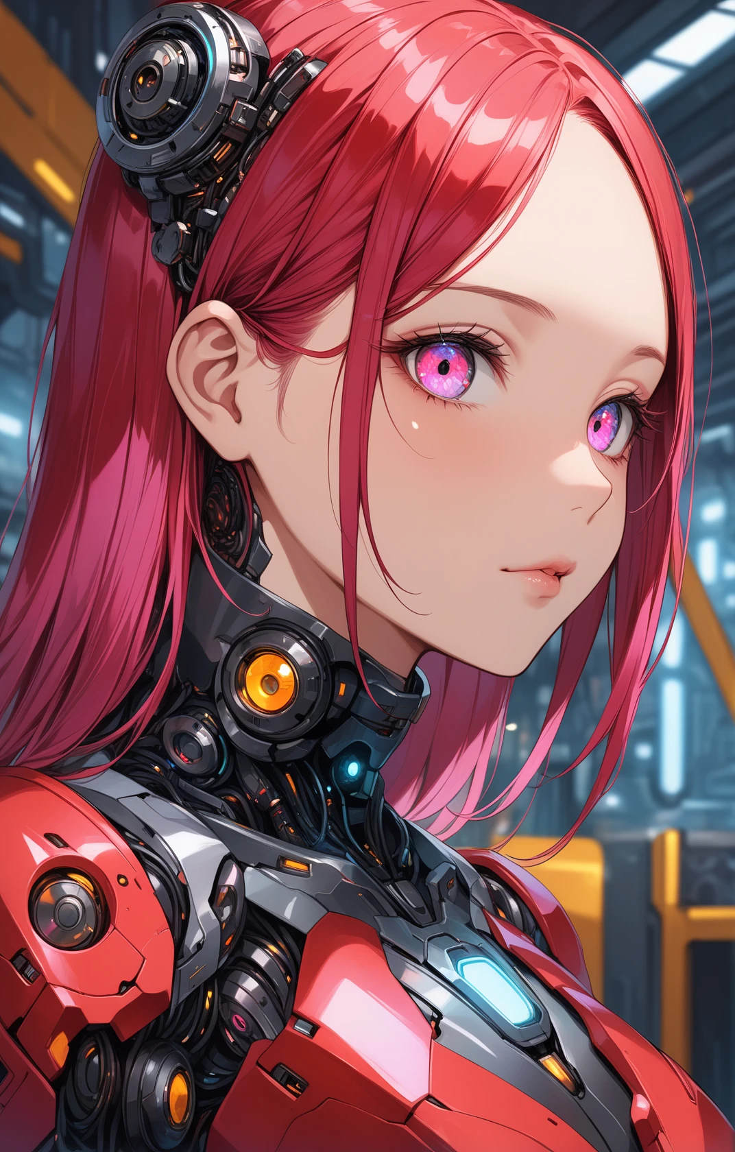 1girl, cyborg, menpo, upper body, portrait, black red body, iridescent shimmering hair, 8K, RAW, best quality, masterpiece, ultra high res, colorful, (medium wide shot) , (dynamic perspective) , sharp focus , (depth of field:1.3) , extremely detailed eyes and face, beautiful detailed eyes, colored eyes, (trimmed gear,In a futuristic weapons factory:1.2) , ((masterpiece, best quality) ), niji, from side, upper body, hips, sideboob