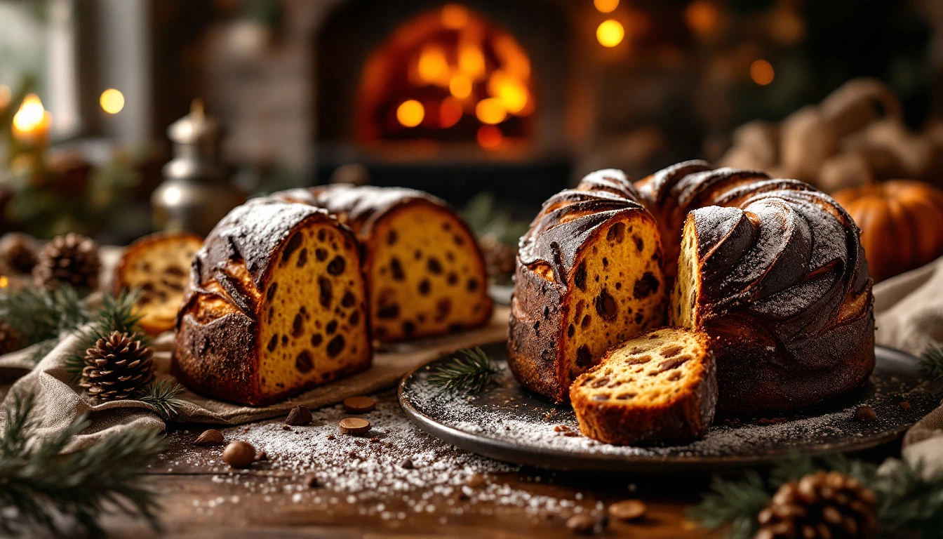 Still life with traditional Christmas chocolate panettone bread, black and gold color palette, wood-fired oven, cozy atmosphere; 8k, intricate detail, photorealistic, realistic light, wide angle, kinkfolk photography, A+D architecture
