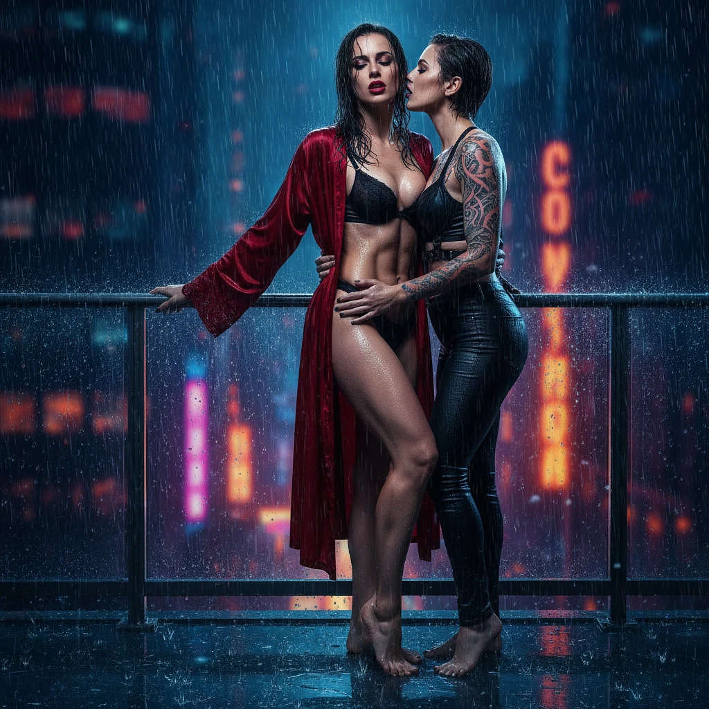 8K RAW cinematic photo of TWO women on rain-slicked glass balcony, Nikon Z7 II, 70-200mm lens, HDR neon city reflections. The FIRST woman, queenpin, abs glowing, thighs taut, implants bulging in crimson silk robe slipped open, lingerie beneath. Hair plastered wet, lips parted, one hand gripping railing. The SECOND woman, fighter, tattoos glowing under rain, leather harness bustier soaked and straining, jeans wet. Short hair dripping, lips plum. One hand wrapped around queenpin’s waist, the other dragging her thigh high against railing. Lips grazing her cheek, sweat and rain gleaming. Atmosphere: RAW HDR erotic noir rainstorm, ultra-real 8K textures, lifelike cinematic fire.