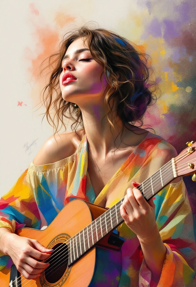 Sketch Art, Beautiful Colored Pencil Line, Artistic Brush Strokes, Beautiful, Woman Playing Guitar, Open Shoulders, Emotional Music in Beautiful Painting Style, Perfect Composition, Incredible Detail and Beautiful Rendering, Trending on ArtStation, 8k Art Photography, Realistic Conceptual Art, Perfect Light in Natural Volumetric Cinematography, Soft Light and Shadows, Award Winning Photography, Masterpiece, Oil on Canvas, Raphael Caravaggio, Greg Rutkowski, Beeple Beksinski, Giger