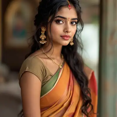 Jennifer Connelly , 21 years old, Indian hair style, wearing a balck saree and , inhaled chest, wide open eyes, A plus curvy shaped body structure, showing pink chudi on hand, , high-quality photo portrait, shot on a dslr camera, photography, environmental, double eyelid --ar 34:65 --style raw, indian ascent, flying kiss.