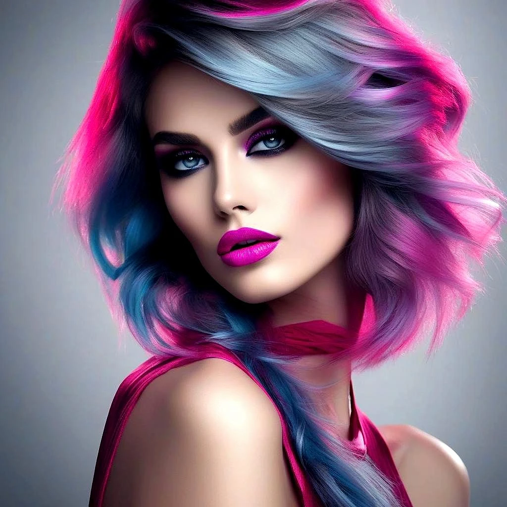A close-up portrait of a young woman with long wavy hair, dramatic and edgy. The hair is colored in a gradient of pink and blue, pink on top and blue on the bottom. The woman is wearing a red tank top and has a serious expression on her face. Her makeup is bold and dramatic, with dark eyeliner and pink lipstick. The background is a neutral gray, which makes the hair color stand out even more.