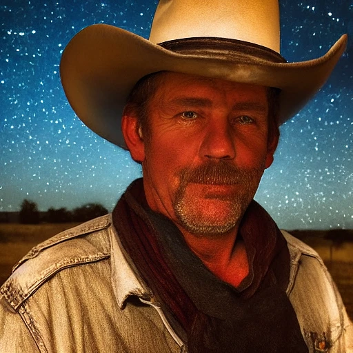 Photograph, color, portrait. cowboy, outdoor, night, rugged, weathered, stoic, cowboy hat, spurs on boots, , deep set wrinkles, piercing blue eyes, a determined expression, standing against a backdrop of a clear night sky filled with stars, the cowboy is looking off into the distance, best quality, ultra-detailed, classic western