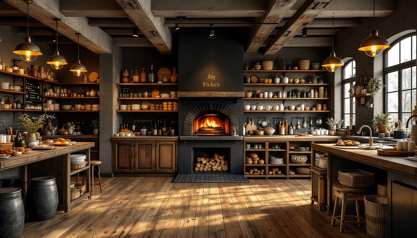 High-resolution interior design photography, artisan bakery workshop, wooden floor, black and gold color palette, wood-fired oven, cozy atmosphere; 8k, intricate details, photorealistic, realistic light, wide angle, kinkfolk photography, A+D architecture