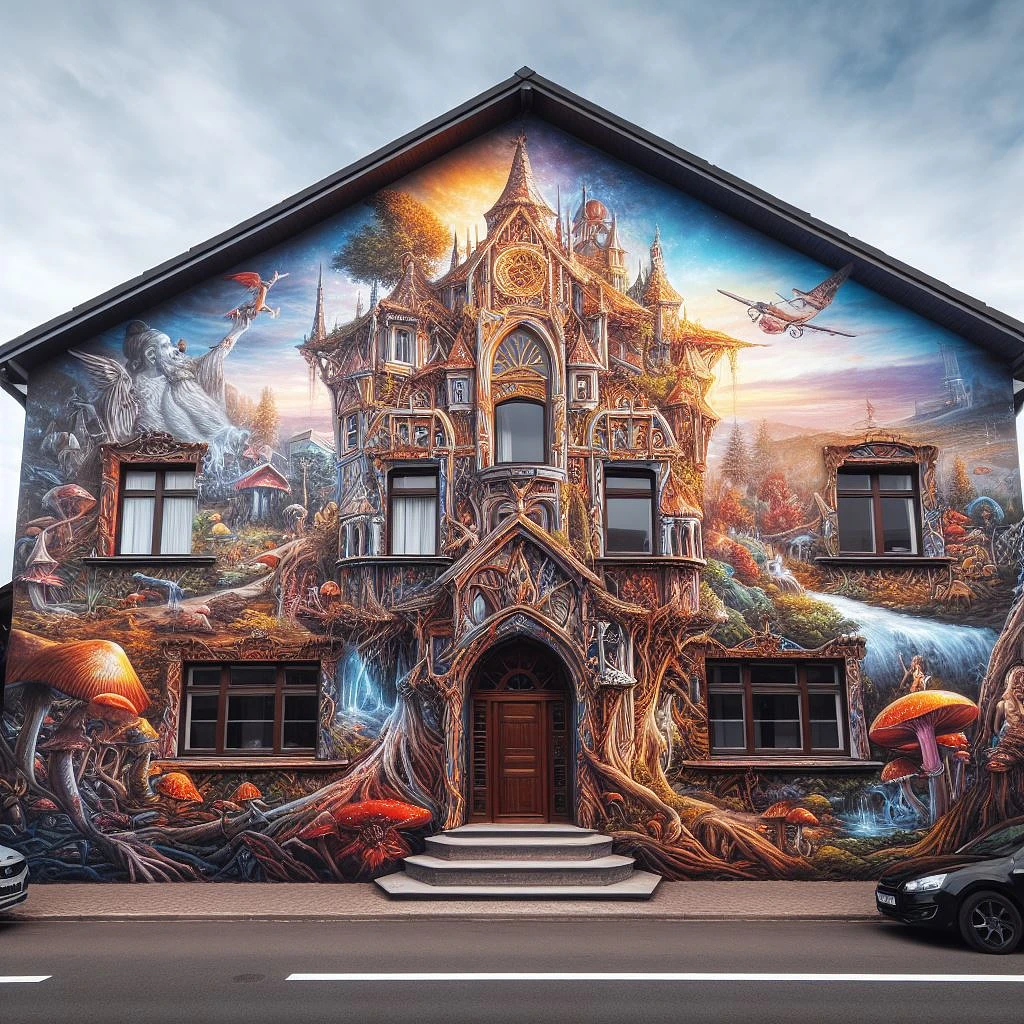 A Majestic Mural Fantasy Graffiti Graphic House in the style of a Famous Street Artist Designer with realistic glittery fantasy paint effects cover the house, professionally photographed with 8k sharp focus quality surroundings, photorealistic, full wide view