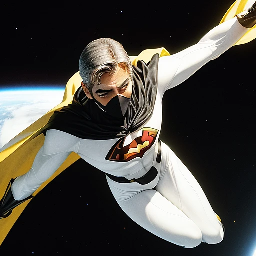 george clooney is wearing a white bodysuit with a wispy yellow cape, black mask connecting to his red and black emblem, power bands, and a power belt. Like many superheroes of the era, he has no visible pupils and is flying in space.
