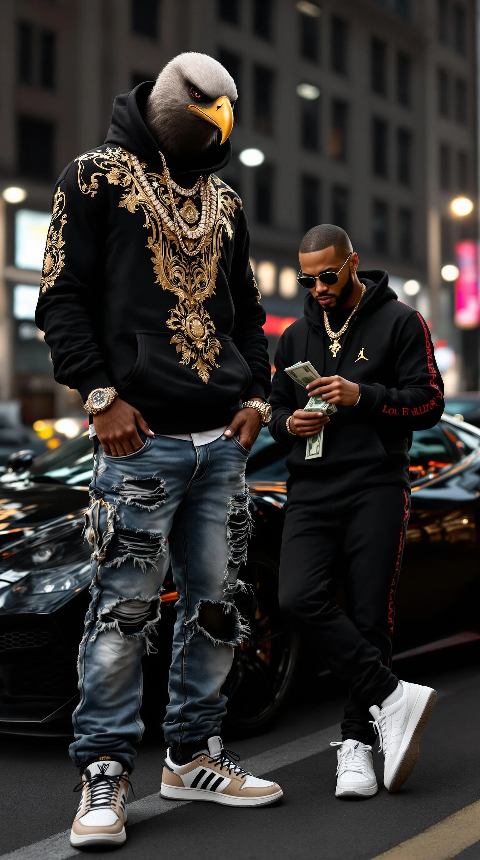 A tall man with the head of a bald eagle stands in a luxury hoodie with golden embroidery, distressed Amiri jeans, and a diamond-encrusted watch. His sharp eyes scan the street as he adjusts his gold chain. Beside him, a normal man in a black Louis Vuitton tracksuit and white Air Jordans leans casually against a Ferrari, flipping through a stack of hundred-dollar bills. The city lights reflect off their jewelry, showing their wealth and dominance