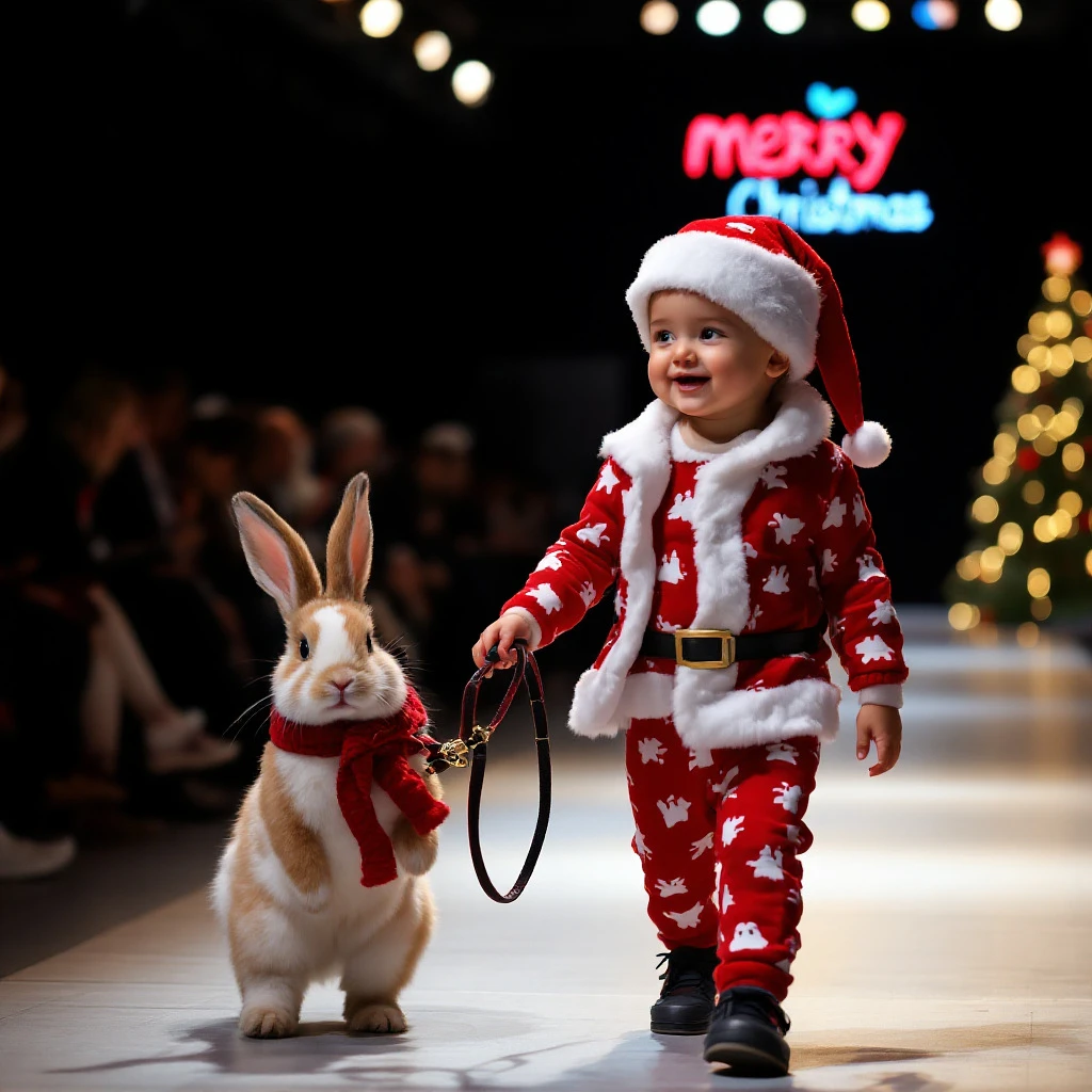 A baby dressed in santa claus pajamas leads a pet bunny on a leash while walking at a Merry Christmas fashion show, the bunny is wearing a santa claus hat, with the logo illuminated in the background "with love"