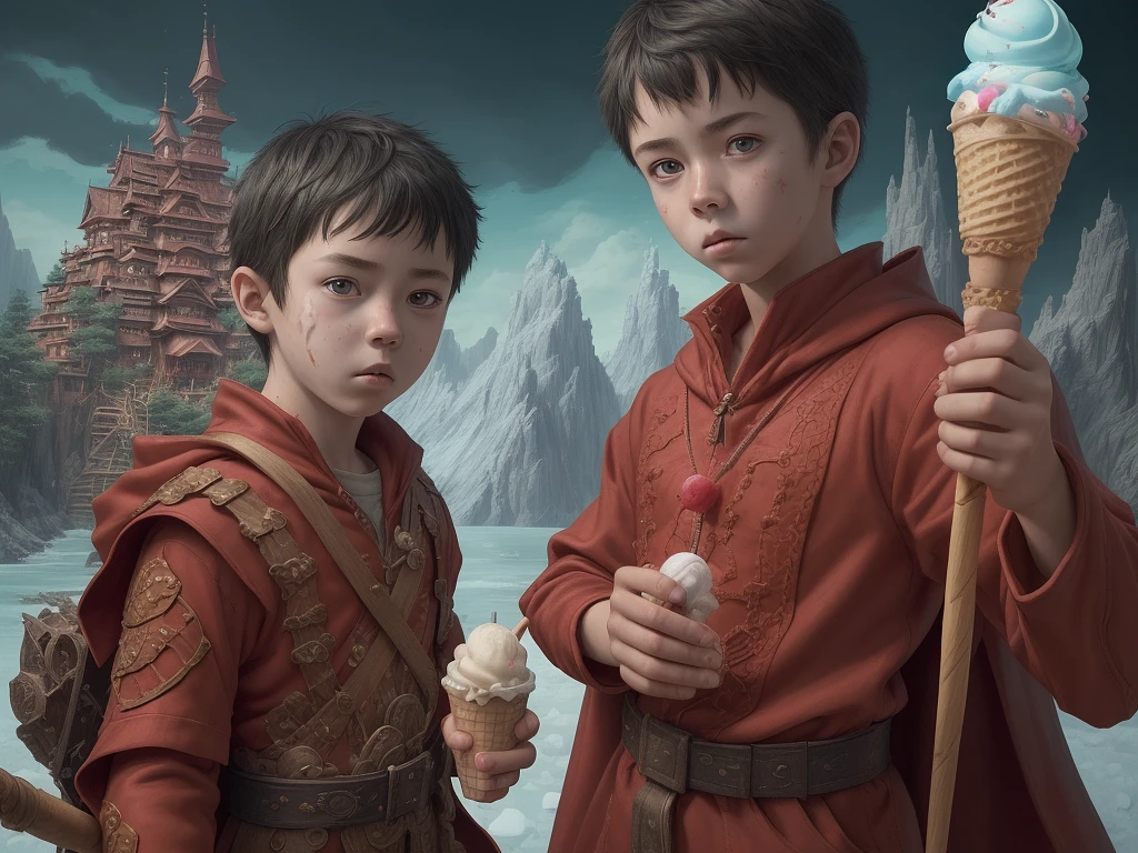 (young boy child wizard) human like adventure, red outfit, wooden staff, intricate, realistic face, detailed portrait, detailed face, insanely detailed, vivid color, trending on artstation, 4k, hyper realistic, focused, extreme details, cinematic, masterpiece, concept art by Katsuhiro Otomo and real studio ghibli, amidst exotic lolly, ice cream and candy landscape, alex ross, eddie mendoza, raphael lacoste, sebastian ludke, concept art, matte painting, highly detailed, rule of thirds, dynamic lighting, cinematic, detailed, magnificiant landscape, denoised, centerd