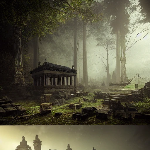 temple in ruines, forest, stairs, columns, cinematic, detailed, atmospheric, epic, concept art, Matte painting, background, mist, photo-realistic, concept art, volumetric light, cinematic epic rule of thirds octane render, 8k, corona render, movie concept art, octane render, cinematic, trending on artstation, movie concept art, cinematic composition , ultra-detailed, realistic , hyper-realistic , volumetric lighting, 8k --ar 2:3 --test --uplight
