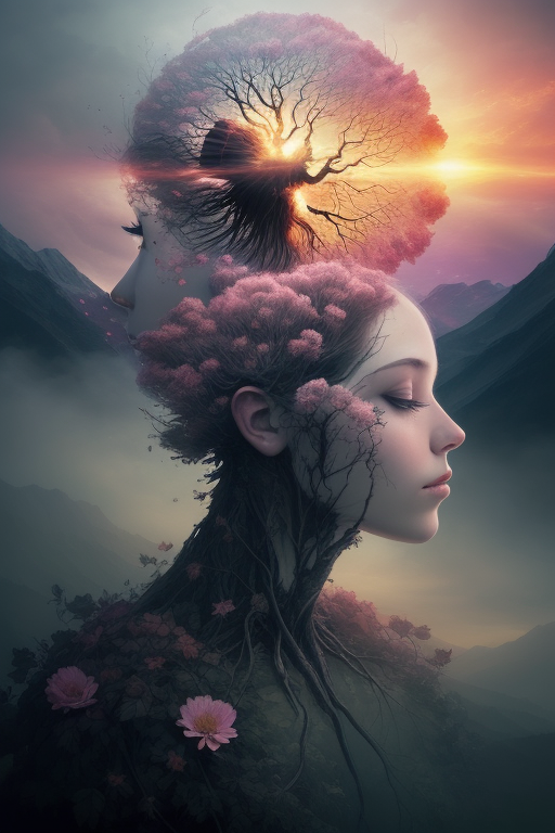 DreamShaper prompt: Nature exploding out a humans head, trees, flowers...