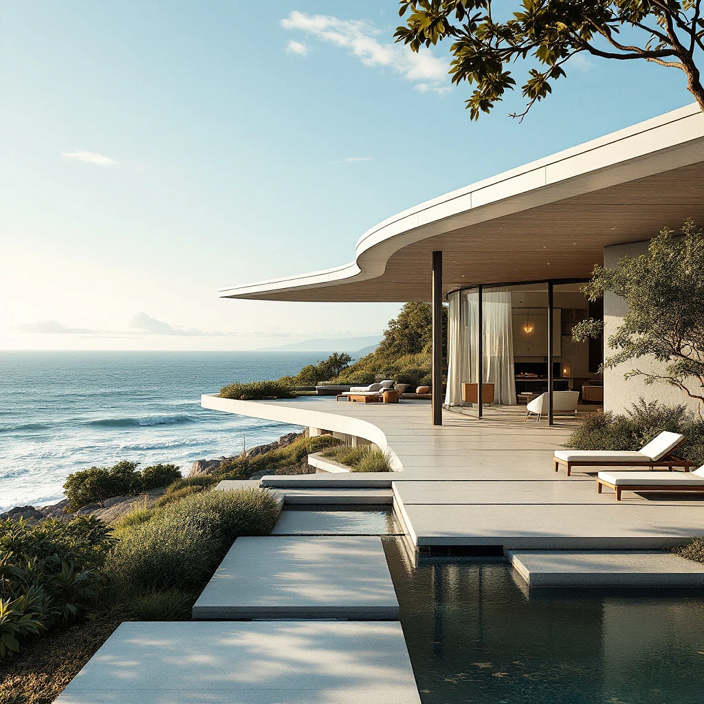 Hyper realistic eye level exterior photo of a mid century modern style house overlooking the ocean, daylight, indirect lighting, AD magazine, Frank Lloyd, Eames, Mies van der Rohe