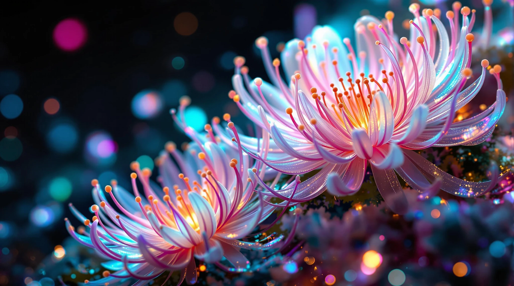 fictive 3d flowers bed macro close up from a dynamic, Unexpected angle, with a sea anemone shape, translucent petals that resemble long, delicate tentacles of the sea anemones, white predominence and vibrant, iridescent colors that shift between hues of pink, turquoise, and gold, set against a dark, near-black background with colorful bokeh, with a subtle gradient of deep blues and purples to make the flowers glow, illuminated by a warm, soft Rembrandt-style lighting that casts subtle shadows and emphasizes the intricate textures, fragile beauty, and added velvety softness, delicate fuzz, and subtle ridges of the flowers, with a sense of intimacy and wonder evoked by the changed vantage point
