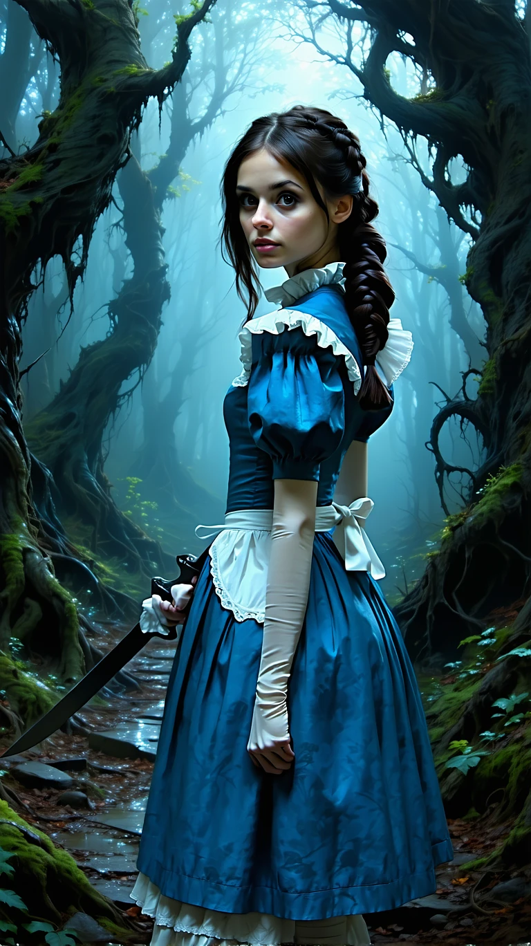 Alice Liddell from Alice: Madness Returns, dark brown hair, pale skin, wearing a blue Victorian-style dress with a white apron, holding the Vorpal Blade, standing in a surreal and eerie Wonderland, dark forests, creepy twisted paths, gothic and dark fantasy art style, highly detailed, wallpaper.