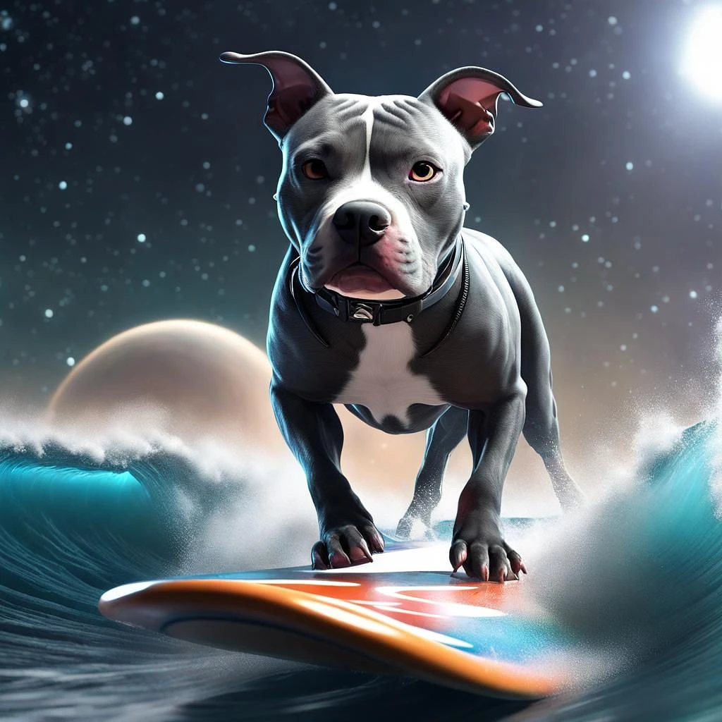a dark gray coat pit bull with white paws and a white nose! , trending on artstation surfing on a surfboard in a crashing wave of alien ocean in space, background is an alien galaxy, aliens in the background, alien colors, octane render, unreal engine 5, wide view, 8k, highly detailed