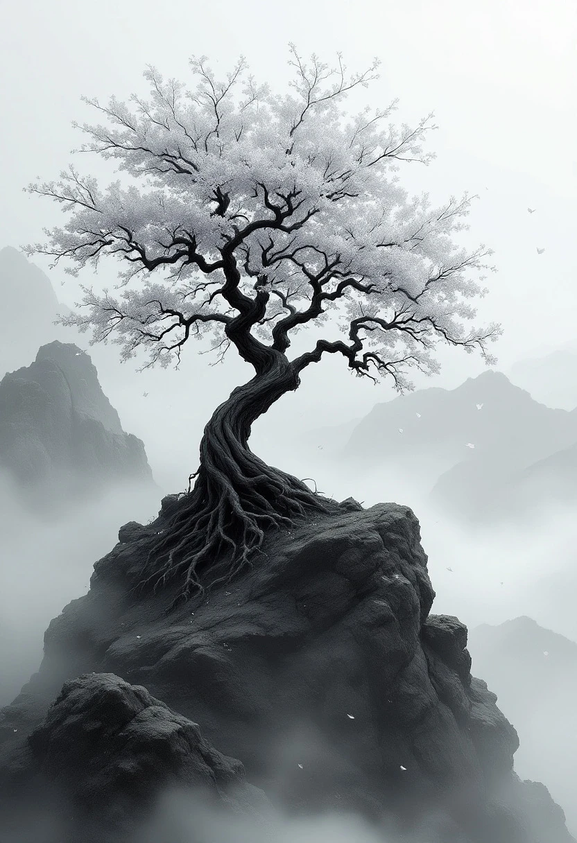 A cinematic grayscale ink-style scene of a twisted sakura tree on a rocky hilltop, surrounded by layered fog and soft mountains in the background. The blossoms are faded gray with just a hint of pale purple or pink, almost invisible in the mist. The tree has a dark, gnarled trunk and roots clinging to the rocks. A few petals drift through the fog, subtle and soft. The environment should feel quiet, ancient, and timeless — no snow-like white blossoms, no bright petals, no fantasy lighting. Match the tone, depth, and mood of a foggy pagoda in a traditional Japanese landscape. Vertical 2:3.