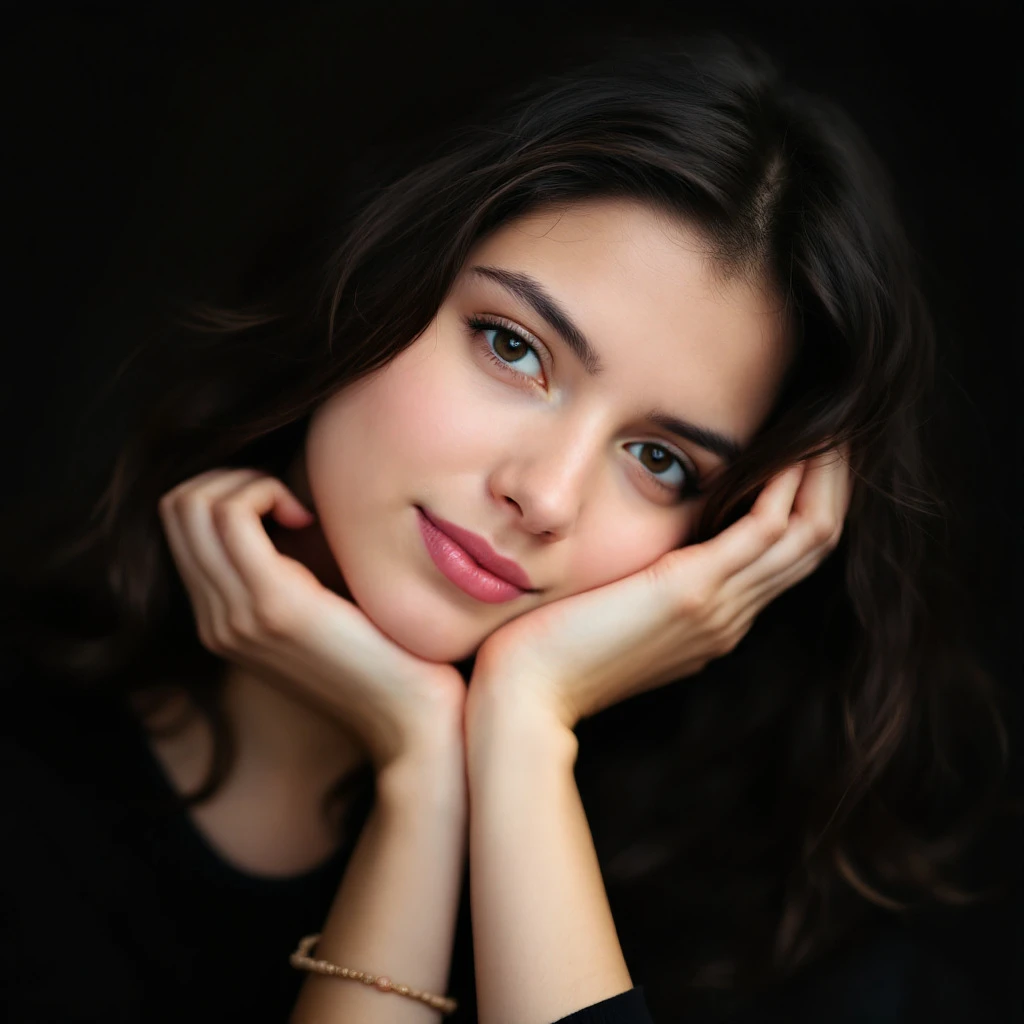 A young woman with long wavy brunette hair rests her head on her clasped hands. She wears a black top and a delicate bracelet on her left wrist. Her expression is soft and contemplative, with natural makeup and subtle pink lipstick. The background is dark and blurred, focusing on her face and hands.