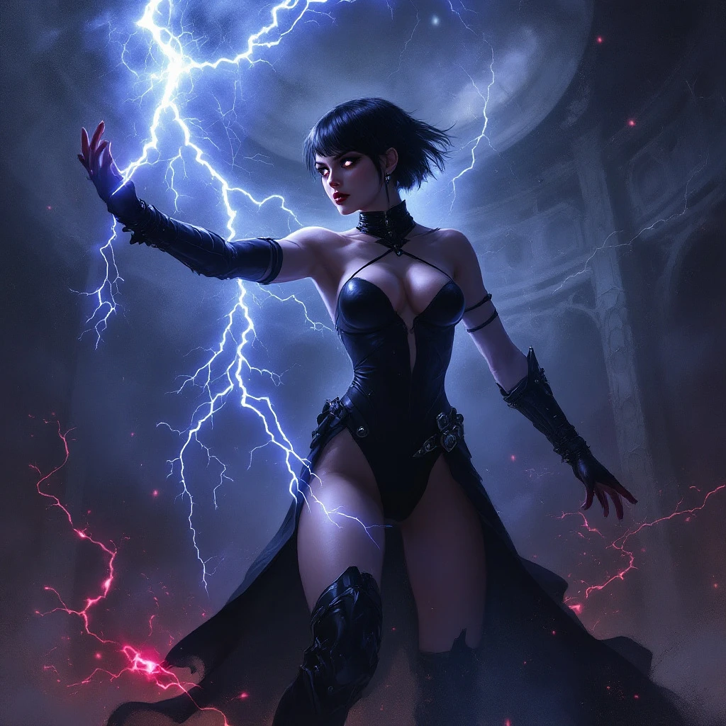 digital oil painting in the style of warhammer 40k of a female petite comissar, standing infront a gothic circh, channeling lightning magic one arm stretched out and casting lightning attack spell, cybereyes, black ultra tight onepiece, black sidecut hair, very big tits