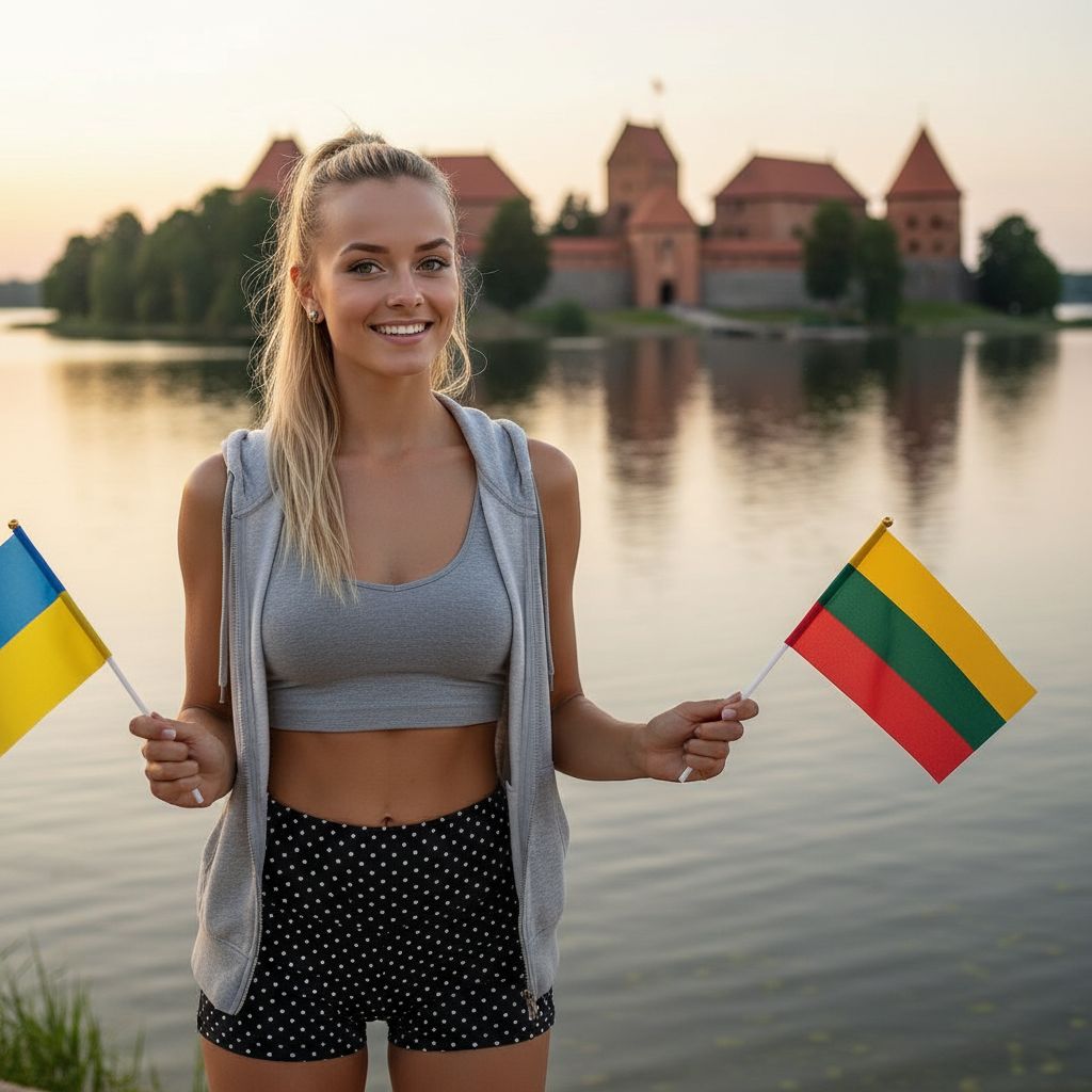 landscape photography, Fitness Fashion close up on face photo of a 21-year Polish girl confident CEO with Challenging head tilt expression. Her body is Visible ribcage with smooth skin and defined, small breast, flat chest. She has European's skin that has a natural glow, especially after a day in the sun. The skin pores and texture are clearly visible and in focus. Her Large pill-shaped eyes, Clear, grey/green eyes, framed by long, elegant eyelashes. Her haircut is ponytail; hair color is Metallic blond. Her eyebrows are Sculpted brows shaped; she smiles s complementing her delicate facial features. She is dressed with Sleeveless hoodie, midriff, Polka dot shorts, She is posed on the left side in the frame by the rule of thirds She poses Trakai stronghold, lights Light box the model is lighted with soft natural lighting in the style of Paulina Olszynski. smile she holds Ukrainian flag small in one hand in another Lithuanian, she in motion
