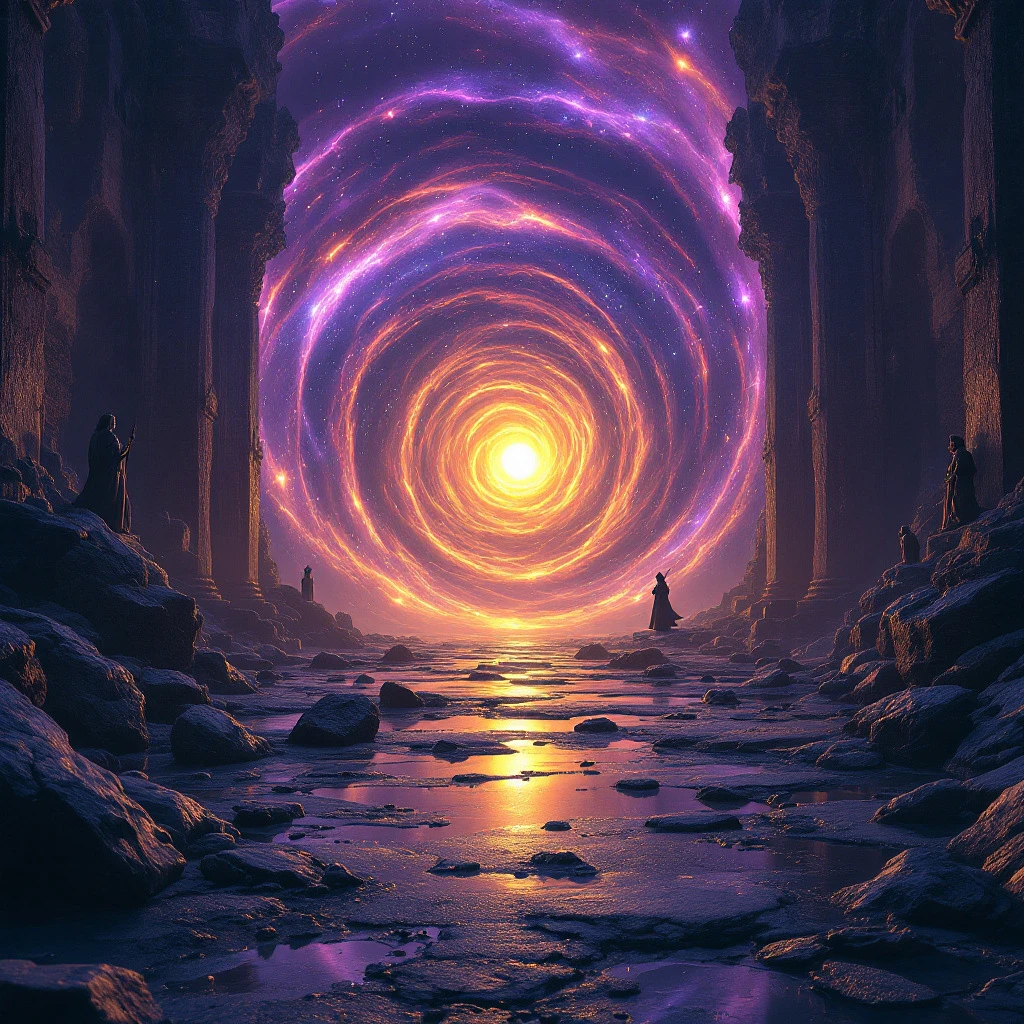 Cinematic fantasy portal scene, swirling galaxy vortex, levitating rocks, broken statues, wet ground with reflections, abandoned wizard staff, cosmic colors (purple, indigo, gold) , dramatic lighting, 8k detail.